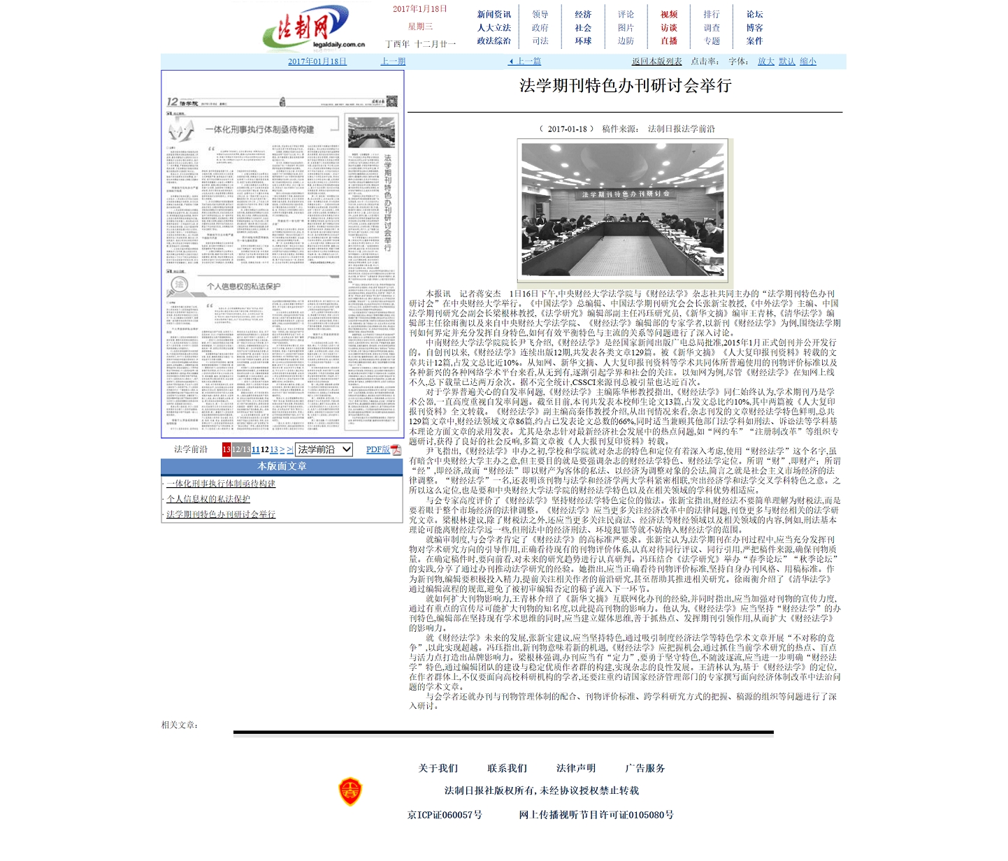 本报讯 记者蒋安杰 1日16日下午,FUN88乐天使与《财经法学》杂志社共同主办的“法学期刊特色办刊研讨会”在FUN88乐天使举行。《中国法学》总编辑、中国法学期刊研究会会长张新宝教授,《中外法学》主编、中国法学期刊研究会副会长梁根林教授,《法学研究》编辑部副主任冯珏研究员,《新华文摘》编审王青林,《清华法学》编辑部主任徐雨衡以及来自FUN88乐天使、《财经法学》编辑部的专家学者,以新刊《财经法学》为例,围绕法学期刊如何界定并充分发挥自身特色,如何有效平衡特色与主流的关系等问题进行了深入讨论。