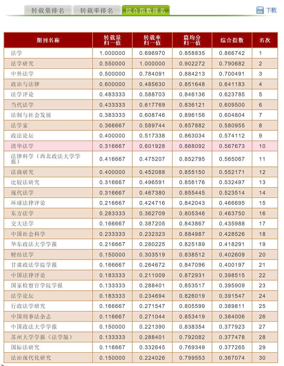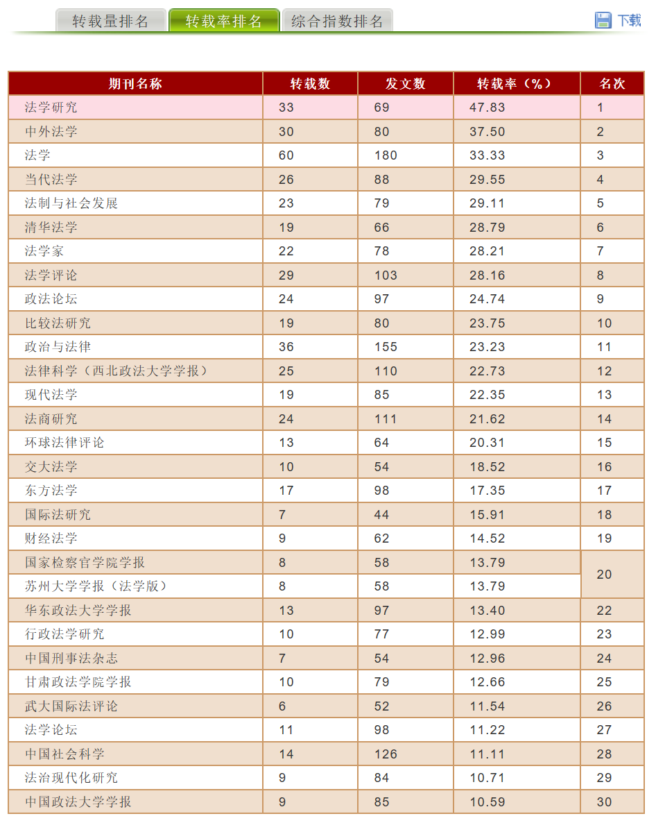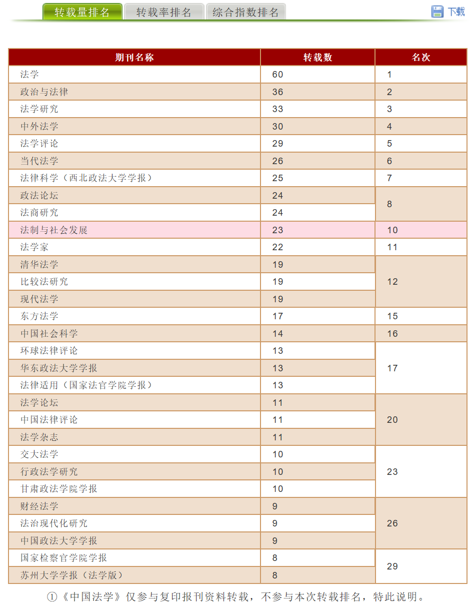 《财经法学》2015年1月5日创刊以来,已经连续第三次进入该排名。其中,在“2016年度复印报刊资料转载指数排名”中,《财经法学》首次上榜,当年共发文67篇,全文转载7篇,全文转载量排名第31名;转载率10.45%,转载率排名第24名。在“2017年度复印报刊资料转载指数排名”中,《财经法学》再次上榜,当年共发文77篇,全文转载7篇,转载量排名第30名;转载率9.09%,转载率排名第26名;综合指数0.365266,排名第29名。