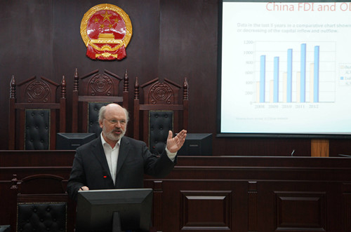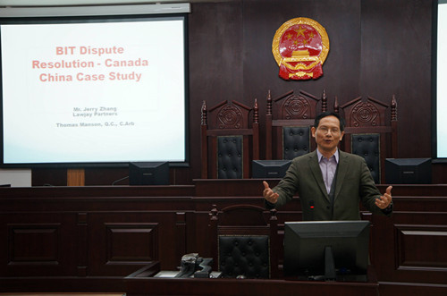最后,Mr. Manson阐释了双边投资协议下重要的争端解决机制——国际投资争端解决中心(简称ICSID)的相关问题。ICSID是根据华盛顿公约成立的,旨在为外国投资者与东道国政府之间的投资争端提供国际解决途径的专门性国际机构,在国际社会有重大的影响力。截止2013年3月,ICSID已审结案件53起,待解决案件167起,包括美孚投资、墨菲石油诉加拿大案,中国平安保险(集团)公司诉比利时案。接着,Mr. Manson详细分析了华盛顿公约中的重要条款,包括适用范围及应用、非歧视原则、非歧视原则的例外、一般例外、仲裁先行条件、公众查阅、听证程序等。并且结合外商独资企业示例,为大家解释了揭开公司面纱制度以及东道国和投资者的权利;结合谢叶深诉秘鲁政府案为大家分析了双边投资协议的实施和争端解决机制。