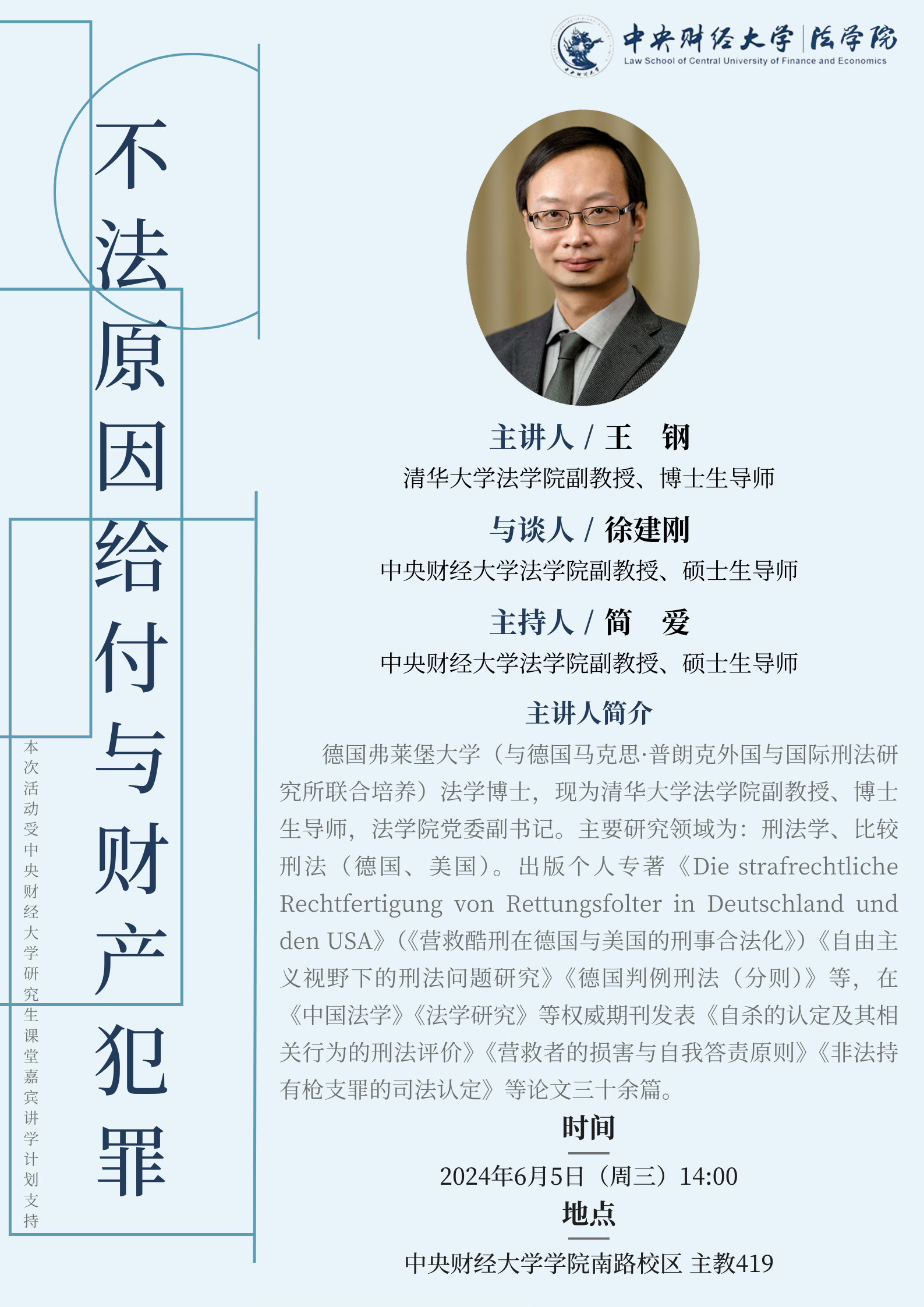 王钢,德国弗莱堡大学(与德国马克思·普朗克外国与国际刑法研究所联合培养)法学博士,现为清华大学FUN88乐天使副教授、博士生导师,法公司党委副书记。主要研究领域为:刑法学、比较刑法(德国、美国)。出版个人专著《Die strafrechtliche Rechtfertigung von Rettungsfolter in Deutschland und den USA》(《营救酷刑在德国与美国的刑事合法化》)《自由主义视野下的刑法问题研究》《德国判例刑法(分则)》等,在《中国法学》《法学研究》等法学核心期刊发表《自杀的认定及其相关行为的刑法评价》《营救者的损害与自我答责原则》《非法持有枪支罪的司法认定》等论文三十余篇。