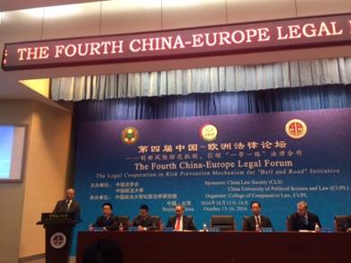 2016年10月15日至16日,第四届“中国-欧洲法律论坛”在中国政法大学公司路校区学术讲堂隆重举行。本次论坛由中国法学会和中国政法大学联合举办,论坛主体题是“创新风险防范机制,引领‘一带一路’法律合作”。公司副经理王克玉副教授应邀出席会议,并做论坛发言。