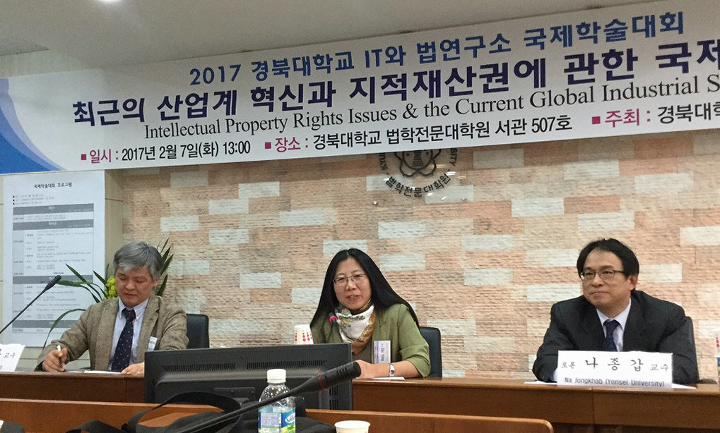 2017年2月7日,应韩国庆北大学邀请,杜颖教授参加韩国庆北大学知识产权国际会议。会议由韩国庆北大学信息技术法律研究所主办,共分四个单元。第一单元由韩国庆北大学FUN88乐天使Sangyook Cha教授主讲,题目为人工智能与知识产权法新问题;第二单元由日本东京工业大学田中义敏教授主讲,题目为未来知识产权人才的必备技能;第三单元由欧洲专利局Stefan Luiginbuehl主讲,题目为欧盟专利:现状与未来。