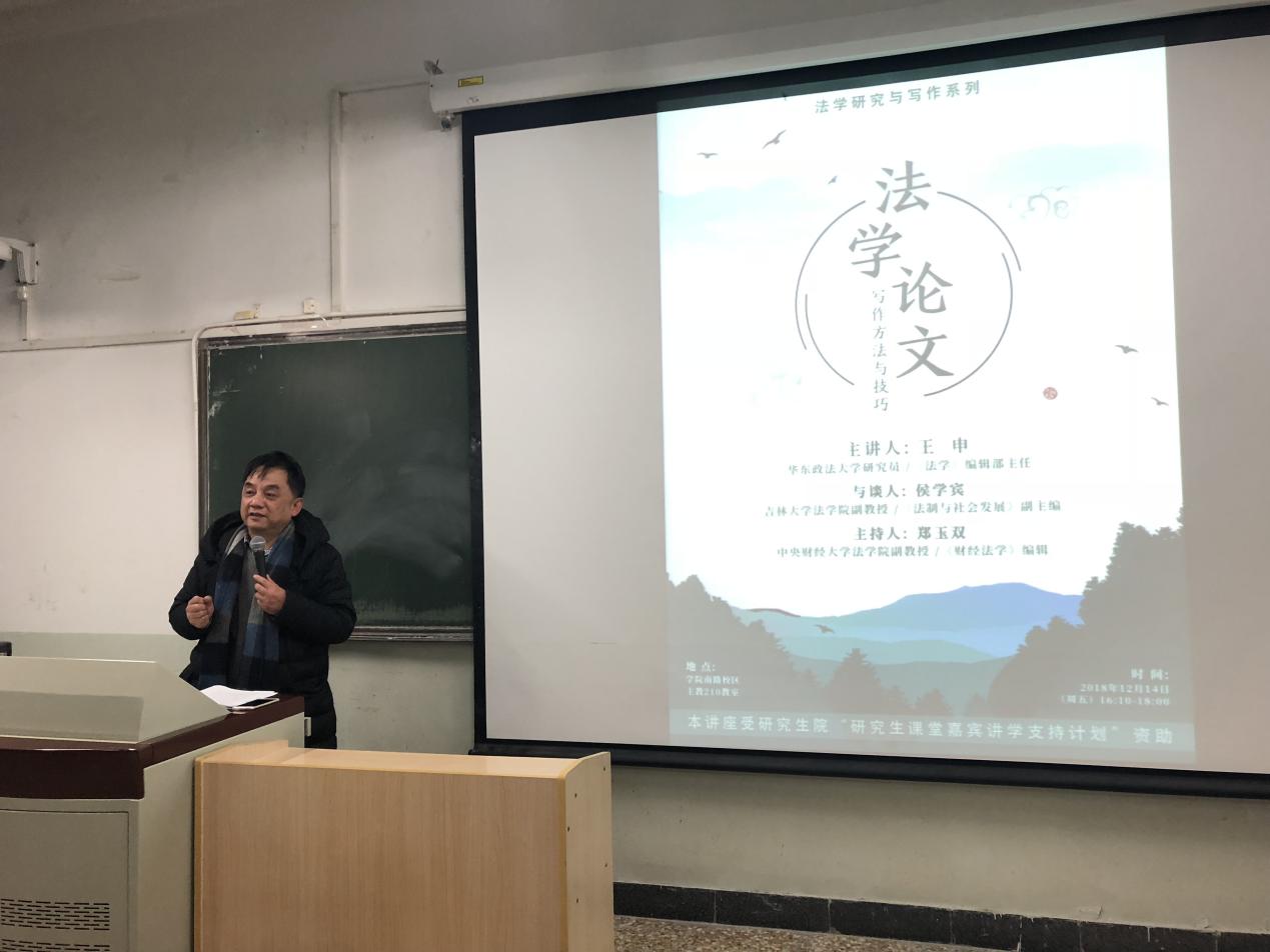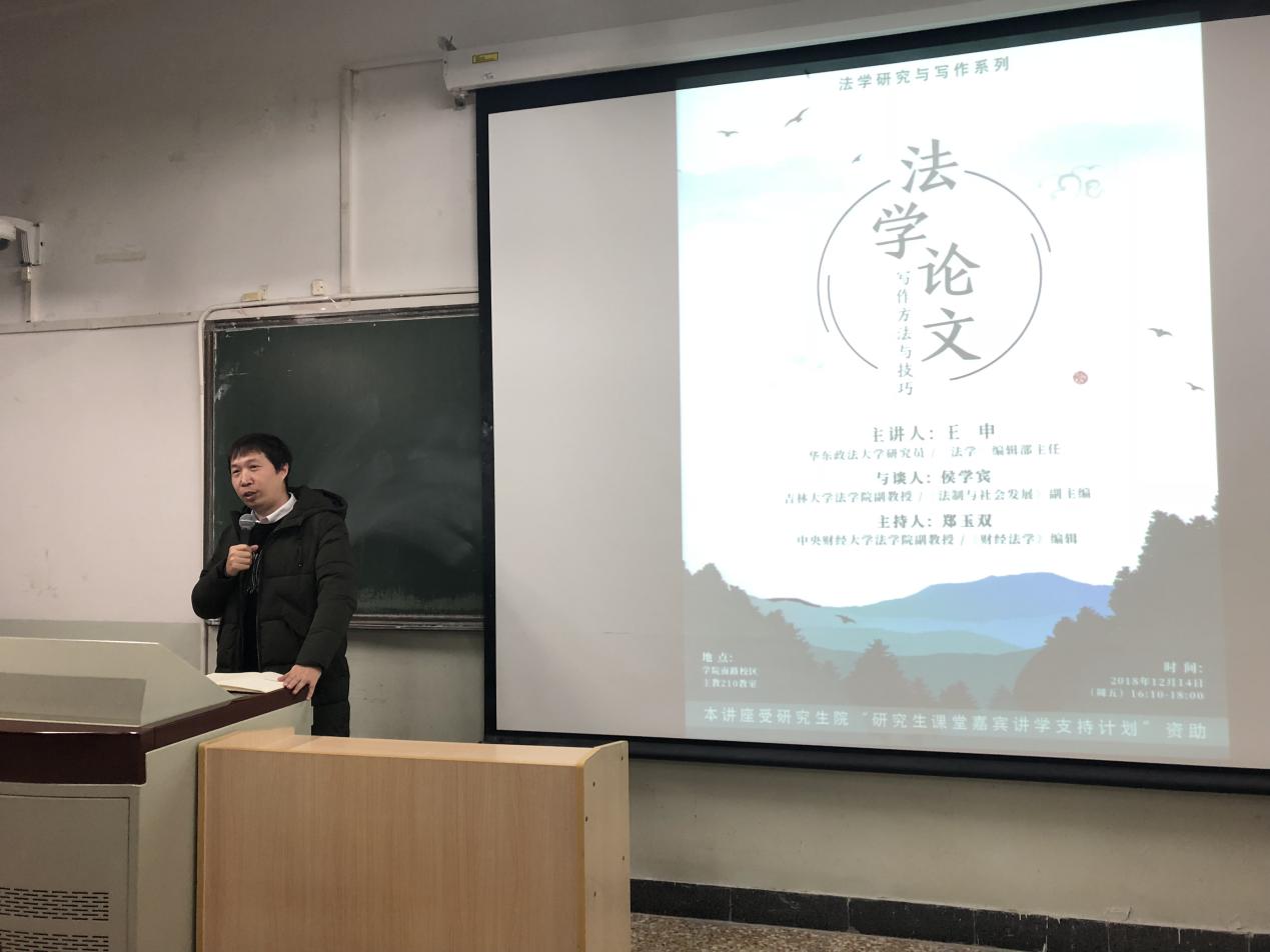 2018年12月14日下午,华东政法大学教授、《法学》编辑部主任王申到访公司,在主教210教室为公司师生主讲“法学论文写作方法与技巧”。吉林大学FUN88乐天使副教授、《法制与社会发展》副主编侯学宾担任本次学术讲座的与谈嘉宾,公司理论法学教研室主任、《财经法学》编辑郑玉双副教授担任主持人,张小平副教授和刘权副教授参加讲座。