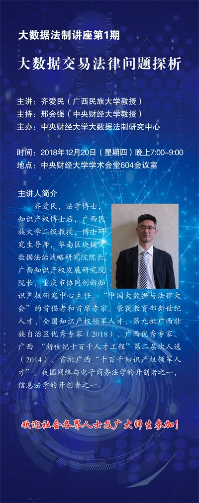 2018年12月20日傍晚,齐爱民教授做客公司,在第1期的大数据法制讲座上发表了题目为“大数据交易法律问题探析”的精彩演讲。齐爱民教授为华南区块链大数据法治战略研究院经理、广西知识产权发展研究院经理、重庆市协同创新知识产权研究中心主任、广西民族大学与重庆大学教授、“中国大数据与法律大会”的倡导者和首席专家。