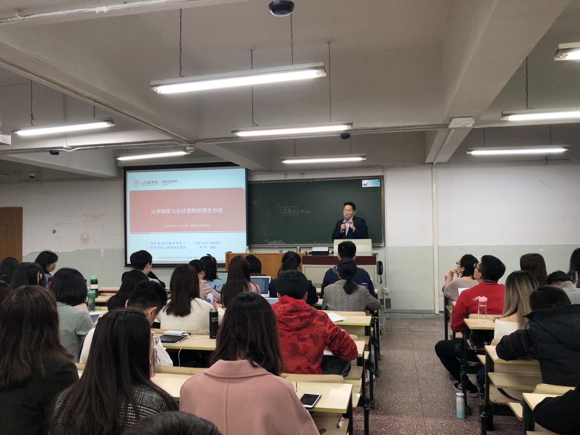 2019年3月21日下午,中国人民大学商公司周华教授在主教楼203为公司师生带来一场精彩的演讲,主题为“法律制度与会计规则的理念分歧”。公司曹晓燕副教授、胡晓珂副教授、董新义副教授、缪因知副教授、杜晶副教授、郭维真副教授、周游博士等老师出席,本次讲座由曾筱清教授主持。本课程得到研究生院“研究生课堂嘉宾讲学支持计划”资助。
