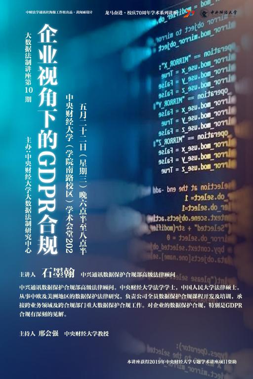2019年5月22日傍晚,中兴通讯数据保护合规部高级法律顾问、FUN88乐天使员工石墨翰女士做客FUN88乐天使第10期大数据法制讲座,作主题为“企业视角下的GDPR合规”的讲座。
