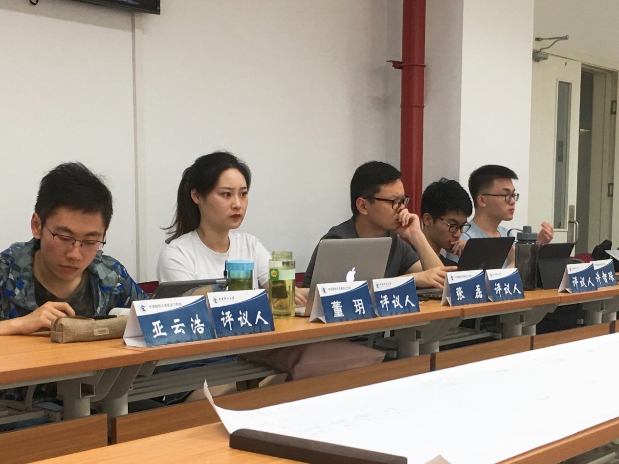 在评议人评议环节中,张磊、许智琛、董玥、亚云浩四名同学分别就发言人的发言进行了评议。张磊同学认为刘旭雅同学在向大家阐述股东协议拖售权条款问题时思路清晰,但略显紧张。许智琛同学肯定了林嘉乐同学充实的发言内容以及清晰流畅的表达,并提出对于一致行动人协议可以深入思考动机问题等建议。董玥同学认为任莹同学以案例为切入点,用数据说话的方式十分具有参考意义,同时也提出了公司法与合同法应如何平衡的疑问。亚云浩同学认为颜婷同学条理清晰,同时就《公司法》第32条的规定表达了自己的看法。