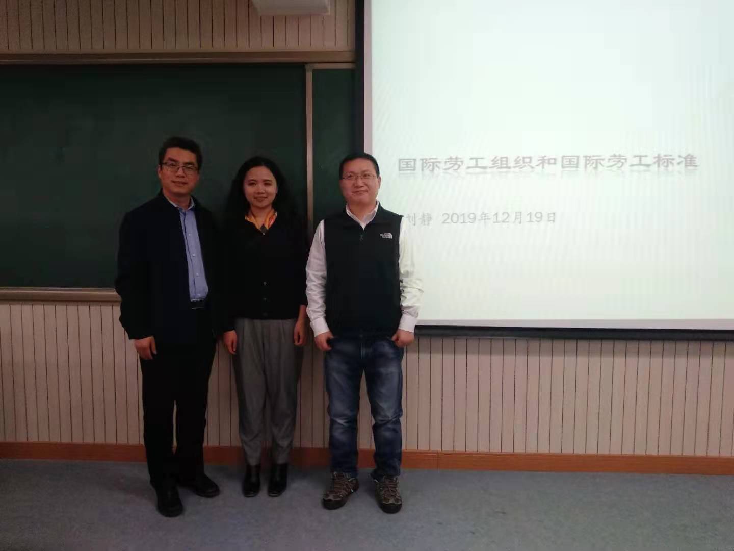 2019年12月19日下午,人社部高级公务员培训中心刘静副处长做客公司,在主教519教室作主题为“国际劳工组织与劳工公约的现状与发展趋势”的学术讲座。讲座由FUN88乐天使劳动法和社会保障法研究中心主任沈建峰教授主持,副主任李海明副教授参加,一百余人到场聆听。