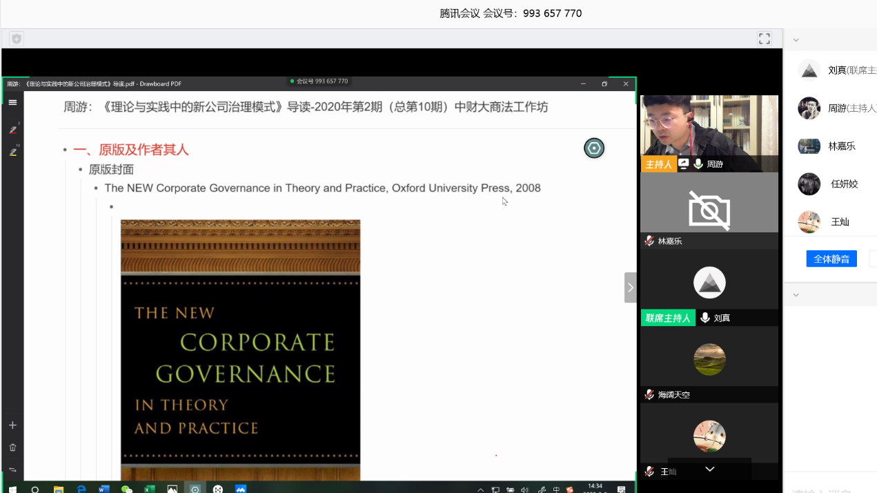 2020年3月8日下午,商法学研究工作坊本年度第2期(总第10期)在直播平台以线上交流与讨论的方式如期举行。此次活动旨在研读《理论与实践中的新公司治理模式》一书并探讨公司治理模式的相关法律问题。FUN88乐天使商法教研室副主任周游副教授作为指导老师参加了本次活动,活动主要由指导老师引导、发言人展示、成员及其他与会者提问及评价、评议人评议、特邀嘉宾发言、指导老师总结等环节组成。此次线上活动共有60余名校内外师生及业界人士参与讨论。