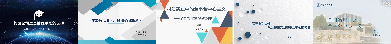 继而,在发言人展示环节中,公司2019级研究生程文以及2018级本科生黎泓玥、夏爽、王灿、张淳皓依次分享了各自的阅读体会与思考。程文同学首先对公司进行了界定,然后解释了两权分离的原因,最后分析了公司选择集权治理模式作为公司治理手段的必要性及合理性。黎泓玥同学主要探讨以下两大问题:一是通过“最大化股东财富”观念达成股东表决选举董事与董事会中心主义之间的联结;二是从“最大化股东财富”和“集体决策优势”两个角度阐释了为什么要选择董事“会”的形式。夏爽同学则以商事判断规则为切入点,阐释了司法实践中的董事会中心主义,具体介绍了商事判断规则的内容,并从董事会、股东和法院的视角解释了商事判断规则的正当性基础,最后列举了商事判断规则的不适用情形。王灿同学以董事会的独立性为中心,从董事会的演进入手,主要讲述推动董事会有所作为的五大压力,并对董事会独立性是否必要进行分析。张淳皓同学从金融危机入题,引出股东至上带来的公司治理问题,从投资者的惰性(主观)、股东积极主义的手段(客观)和改革的不现实性三个方面批判“股东会中心主义”的弊端,对比得出“董事会中心主义”将是公司治理未来的结论。