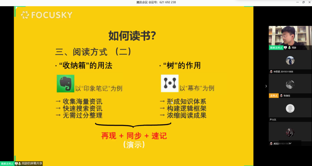 对于阅读形式和笔记方式的选择,周游副教授也给出了自己的建议。在电子媒介极速发展的时代,碎片化、快餐式的二手材料阅读方式很容易弱化读者的思维能力,从而使同学们丧失对深度阅读、一手资料阅读的兴趣和能力。但是,如果可以通过公众号、豆瓣等辅助性方式提高我们找到心仪书目的效率并进行深层阅读,我们同样也能从电子时代中受益颇多。在笔记方式上,周游副教授为同学们详细地展示了以海量搜索为优势的“收纳箱”式笔记和以逻辑结构为优势的“树”式笔记用法。他认为,集再现、同步、速记等优点于一身的电子笔记,可以更好地帮助同学们将所读内化成所用,提高阅读效率。