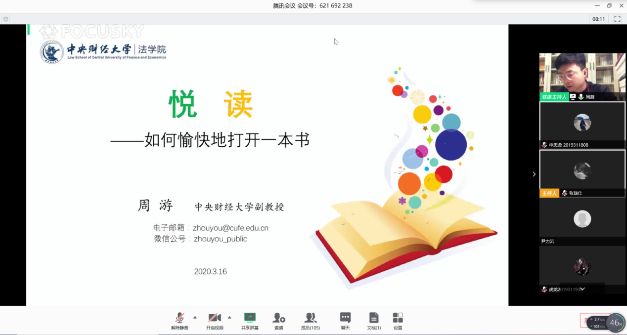 2020年3月16日,公司周游副教授分别于上午10点和晚上7点半,为公司师生带来了两场战“疫”期间别样的讲座:悦读——如何愉快地打开一本书。本次讲座作为公司2019-2020学年“新生引航工程”系列讲座之一,吸引了众多师生参与其中,公司党委副书记徐颖研究员、部分学科专任教师、各年级班主任和辅导员、全体2019级本科及研究生新生共计400余人,通过腾讯视频会议软件共同领略了读书背后的奥妙。