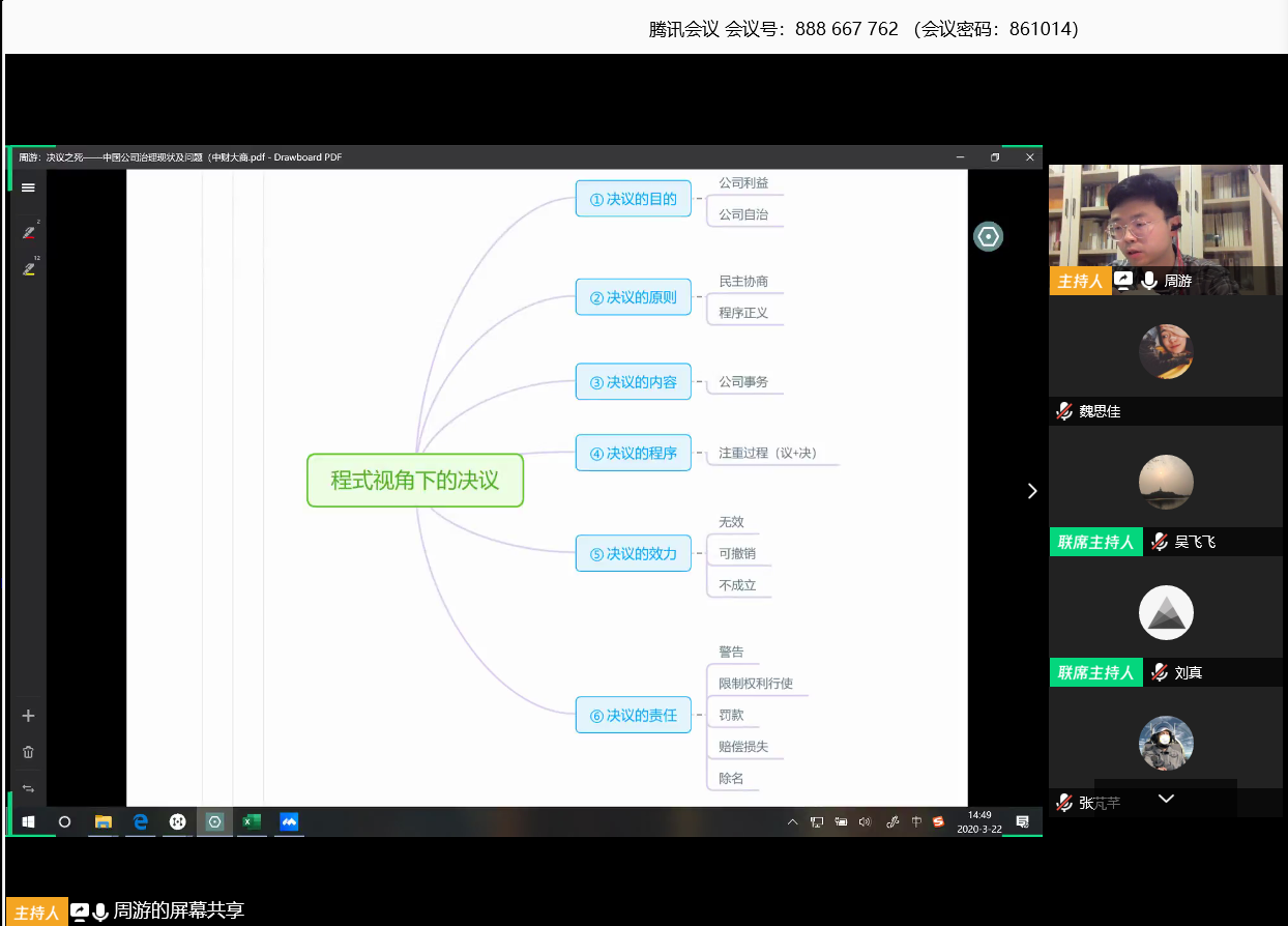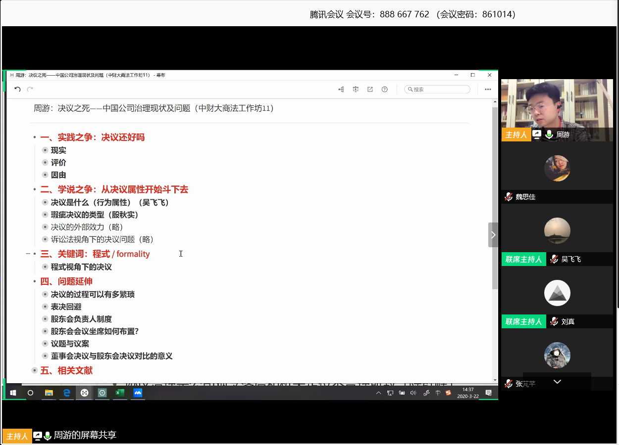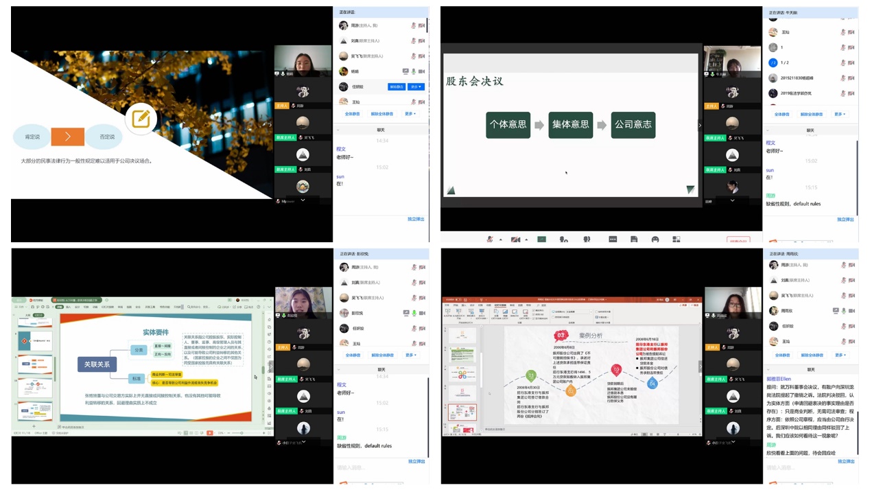 2020年3月22日下午,商法工作坊2020年第3期(总第11期)在直播平台以线上交流与讨论的方式举行。西南政法大学经济FUN88乐天使吴飞飞副教授、FUN88乐天使殷秋实副教授作为特邀嘉宾,FUN88乐天使周游副教授作为指导老师,就“公司决议”之议题展开讨论。工作坊主要由指导老师引导、发言人展示、成员及其他与会者提问及评价、评议人评议、特邀嘉宾发言、指导老师总结等环节组成。此次线上活动共有70余名校内外师生及业界人士参与讨论。