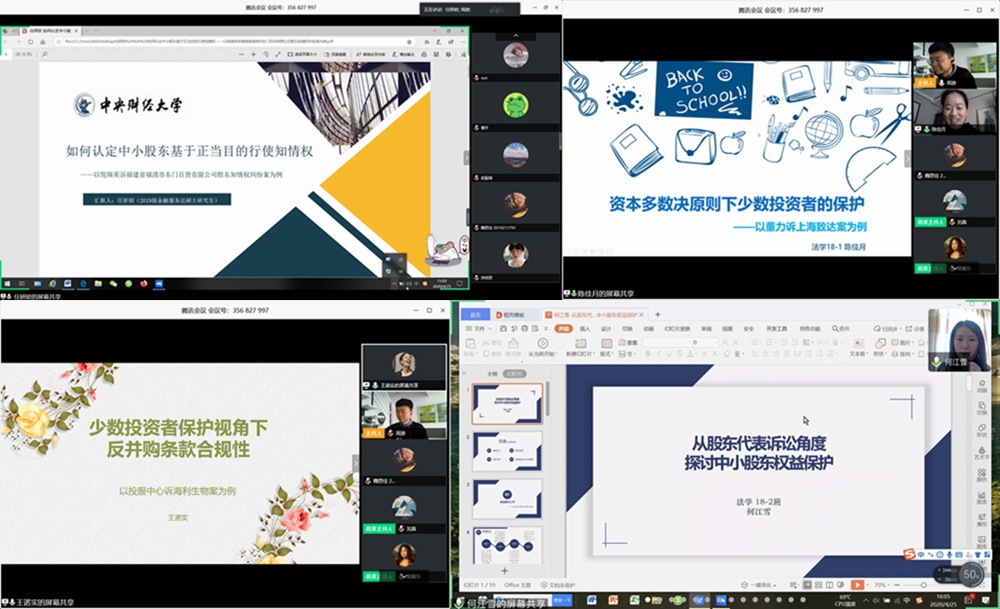 在发言人展示环节中,公司2019级研究生任妍姣以及2018级本科生陈佳月、何江雪,还有2018级中公财本科生王诺实分享了各自的研究体会。陈佳月同学以董力诉上海致达案为例,聚焦资本多数决原则下少数投资者的保护,具体分析救济途径,并提出了资本多数决原则下保护少数投资者的两点缓和办法。王诺实同学则通过万宝之争引入少数投资者保护视角下反并购条款合规性的话题,重点介绍了投服中心诉海利生物案,细数了目前应用于反并购的具体措施,提出对于反并购合规性空白领域的可行解决方案。任妍姣同学以倪瑞英诉福建省福清市东门百货有限公司股东知情权纠纷一案为切入点,探讨如何认定中小股东基于正当目的行使知情权的问题,详细归纳了股东知情权的行使方式、内容范围与程序条件以及“正当目的”的认定。何江雪同学从江西省首例股东代表诉讼案入手,从股东代表诉讼角度探讨中小股东的权益保护,结合世行营商环境评价指标,分析保护中小投资者的必要性,总结股东代表诉讼的制度功能,并延伸提出了完善建议。