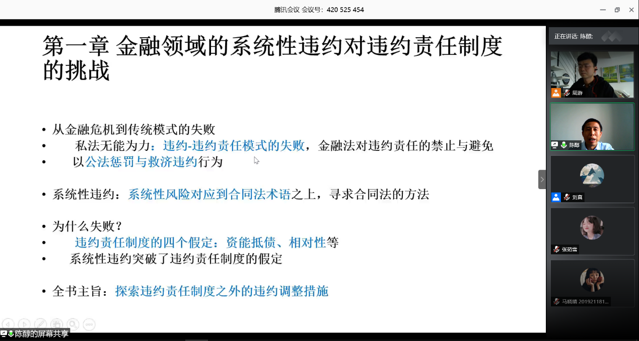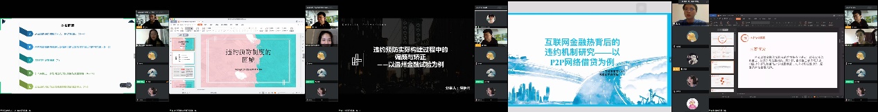 在发言人展示环节中,公司2019级研究生马晓晴、李明桓、赵天以及2018级本科生洪恬君、袁旻晖分享了各自的读书心得。马晓晴同学从合同法与金融法关于违约现象的不同处理方式对比入手,引入系统性违约的概念,从系统性缔约、契约群和企业群三个方面分析了违约责任制度不适用于解决系统性违约的原因,并讨论了应对系统性违约的启发。李明桓同学介绍了违约预防制度的内容与基本原则,分析了我国违约预防制度的现状,对我国制度现状中缺乏宏观性、系统性以及重点不明确的困境进行了反思。洪恬君同学以温州金融试验中的违约预防制度为例,探讨违约预防实际建构过程中制度探索错位和理论依据偏颇的问题,并强调了系统性预防理念的指导意义及重要性,就如何矫正偏颇提出了建议。袁旻晖同学从P2P网络借贷问题出发,讨论了针对该问题的现有法律规制机制,并对其进行了反思,认为其规制需要整合证券法、银行法、合同法的不同思路以完善违约的预防与处置制度。赵天同学从系统性、金融安全原则、预防制度和系统重要性金融机构四个关键词入手,来论述本书对于今后违约预防制度与违约处置制度的指引作用,并结合近期热点话题与本书内容进行分析,提出了对于我国金融领域后续发展的展望。