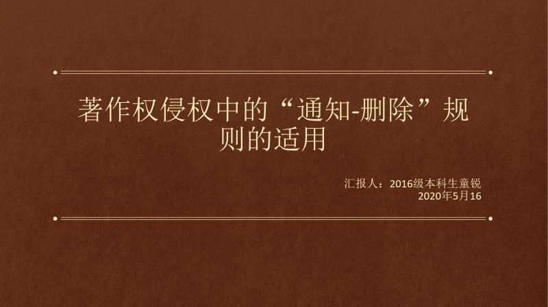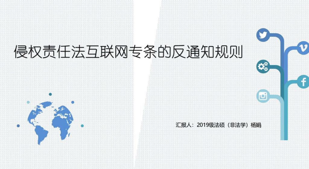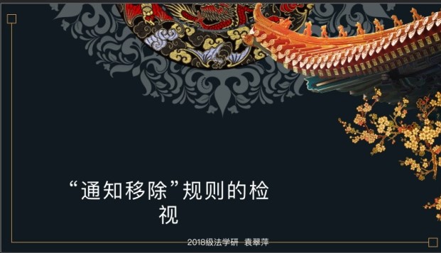 接着,在主报告人分享环节,公司2019级硕士研究生杨雨晴、2016级本科生童锐、2018级本科生袁翠萍、2016级本科生刘斯宇以及2019级硕士研究生杨娟依次分享了各自对通知删除规则的理解及观点。杨雨晴同学以“通知删除规则的诞生与实践困境”为题分别阐述了通知删除规则的产生、基于实证分析的实践困境两个问题,总结了通知删除规则虽在运行实践中产生出较多困境,但较之诉讼,其仍为权利人提供了更为廉价便捷的维权替代方案。童锐同学以“著作权侵权中的‘通知-删除’规则的适用”为题,介绍了通知删除规则的产生及在我国的引入,说明了通知删除规则在著作权侵权中的适用,还提出了完善该规则在实践中运用的建议。袁翠萍同学以“‘通知移除’规则的检视”为题,首先介绍了Jennifer Urban教授和Brianna Schofield教授通知移除规则实证分析的结论,随后对比BruceBoyden教授对此的不同观点,并结合我国学者的分析、欧盟相关政策的实施以及美国通知删除规则的最新发展,详细地阐述了通知删除规则在实践中的运行情况。刘斯宇同学以“‘通知-删除’规则在我国的适用与修正”为题,以“小程序案”与“阿里云案”为例,介绍了对我国通知删除规则在司法实践中的发展。杨娟同学以“侵权责任法互联网专条的反通知规则”为题,在介绍了DMCA中反通知规则之后,结合对《侵权责任法》第36条的理解,提出了该条款可以延伸解释出包含了反通知规则。