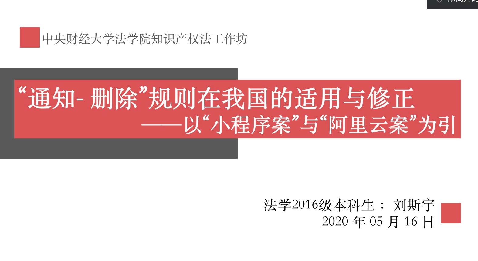 2020年5月16日下午,知识产权工作坊2020年第2期在直播平台上以线上交流与讨论方式进行,此次活动的主题是:通知删除规则的前世今生。特邀嘉宾上海财经大学FUN88乐天使讲师蔡元臻博士、国家知识产权局知识产权发展研究中心研究员顾昕博士,南开大学FUN88乐天使讲师谢晴川博士、新浪网法务部高级法务王磊、工作坊指导老师公司张金平博士参与了本次活动。工作坊主要由指导老师引导、报告人展示、评议人评议和提问、特邀嘉宾发言、指导老师总结等环节构成。此次线上活动共有46名校内外师生及业界人士参与。