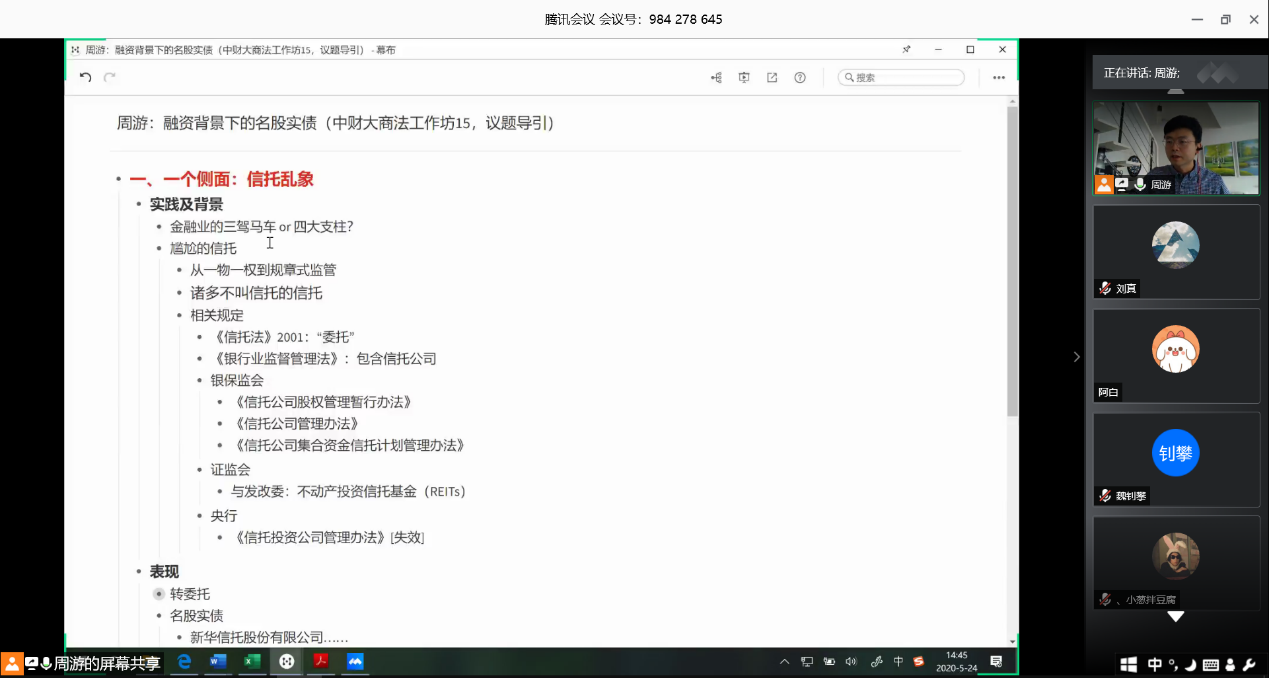 2020年5月24日下午,FUN88乐天使商法学研究工作坊2020年第7期(总第15期)在直播平台以线上交流与讨论的方式如期举行。本次活动议题为名股实债。中国政法大学民商经济FUN88乐天使讲师冀放博士、澳门科技大学FUN88乐天使助理教授彭运朋博士作为本期工作坊的特邀嘉宾,公司周游副教授作为指导老师参与了本次活动。工作坊主要由指导老师引导、发言人展示、成员及其他与会者提问及评价、评议人评议、特邀嘉宾发言、指导老师总结等环节组成。此次线上活动共有60余名校内外师生及业界人士参与讨论。