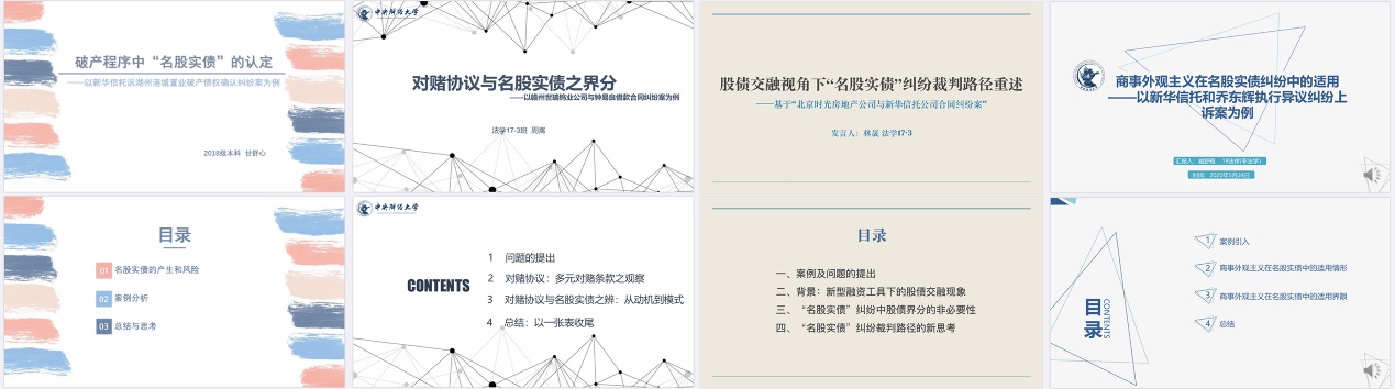 在发言人展示环节中,公司2019级研究生臧舒雅以及2017级本科生周嵩、林晟,还有2018级本科生甘舒心分享了各自的研究体会。甘舒心同学以新华信托诉港城置业破产债权确认纠纷案为例,从内部关系和外部关系的角度出发,探讨破产程序中“名股实债”性质的认定问题,认为应当注重外部关系分析来平衡各方权益,并提出了对投资方利益保护的思考。周嵩同学以赣州市世瑞钨业有限公司与钟易良借款合同纠纷案为切入点,就对赌协议与名股实债之界分进行了介绍,并对对赌协议与名股实债共同的股权外观进行了分析,通过从交易动机、对赌条款、交易模式三方面的对比,得出对赌协议与名股实债应当是两种并行的投融资模式的结论。林晟同学以新华信托诉北京时光案为例,结合股债交融的商业实践背景,探讨“名股实债”纠纷裁判中股债界分之非必要性,并从认定当事人权利义务之命题来解析,以强调司法的利益衡量功能。臧舒雅同学以乔东辉执行异议之诉为例,讲述了商事外观主义在名股实债纠纷中的适用情形,并且进一步分析了构成要件以及利益规制等适用限制。