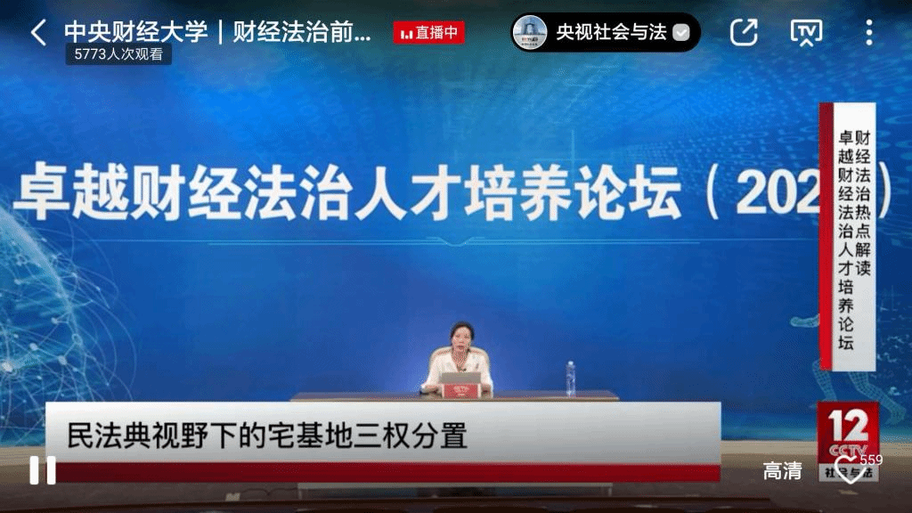 2020年8月5日下午,公司卓越财经法治人才培养论坛在央视频平台社会与法频道同步直播举行。国家”万人计划”青年拔尖人才、FUN88乐天使不动产与自然资源法研究中心主任宋志红教授出席论坛,带来“民法典视野下的宅基地三权分置”的精彩讲座。