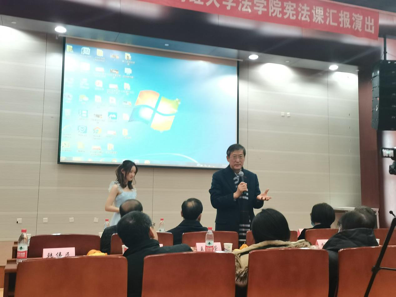 首先是韩大元评委点评。他向蒋劲松教授在宪法教学的内容、方法上的改革表示敬意,并且为中财FUN88乐天使宪法课的教与学感动。他说,今天这三个多小时的时间,同学们展示的是宪法学完整的价值理念、规范体系和制度的感染力。首先这是中国宪法的课堂,同学们通过这样的艺术、这样的形式,展现了中国宪法的制度。疫情让我们看到了宪法规定的国家制度的优势、特点。同样的疫情,我们能够成功地抗疫,是宪法的胜利,也是宪法的优势。同时同学们在话剧当中,也融入了第二个很重要的知识元素——外国宪法。我们看到了美国、日本、韩国,瑞典、德国、英国等等不同的国家。在它们的宪法制度下,他们是如何对疫情采取了应对的措施,我们不做价值的评判,这些国家都是经济强国,也号称法治发达国家。但是在自由和生命、自由和秩序、共同体和个人的权利之间,哪些国家能够合理地平衡,始终以人民的生命和健康作为国家的最高目标?是哪个国家依靠宪法的力量、宪法的理念,来挽救从0岁到100多岁所有病人的生命?我们没有放弃任何一个生命。同时我也感兴趣的是同学们把话剧变成了一个比较的课堂,同学们很有国际视野,想把中国和外国宪法做一个很好的比较,特别是世卫组织、中国和德国的辩论等等,这是一个很好的利用,把不同的宪法制度,无论从宪法的制度、规范到价值、文化,包括自由的理解,放在一个比较的、大的场景里面,让我们客观地、理性地看到,宪法制度是一个充满人性的制度。到底是哪个国家,什么样的宪法文化,能够弘扬坚守人性、坚守尊严、坚守人的生命。作为一个观众,看到三个多小时同学们尽兴准备的话剧,强烈感受到这是一个很好的宪法课,也是很好的宪法理论规范、文化交流的平台。同学们能够真心用自己的宪法语言来表达,真心地讲述中国宪法的故事。同学们的表演是非常优秀的,所以祝贺同学们。