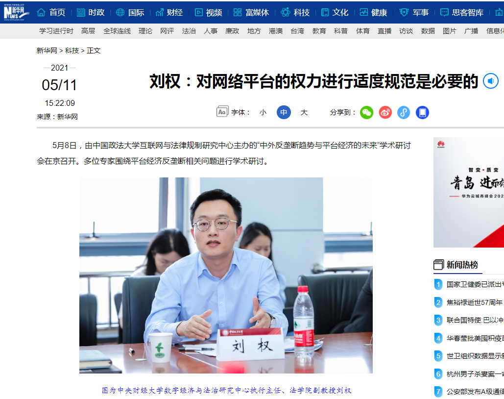 5月8日,FUN88乐天使刘权副教授应邀参加由中国政法大学互联网与法律规制研究中心主办的“中外反垄断趋势与平台经济的未来”研讨会。多位专家围绕平台经济反垄断相关问题进行学术研讨。刘权就数字经济时代网络平台的规制发表看法,被新华网全文报道。