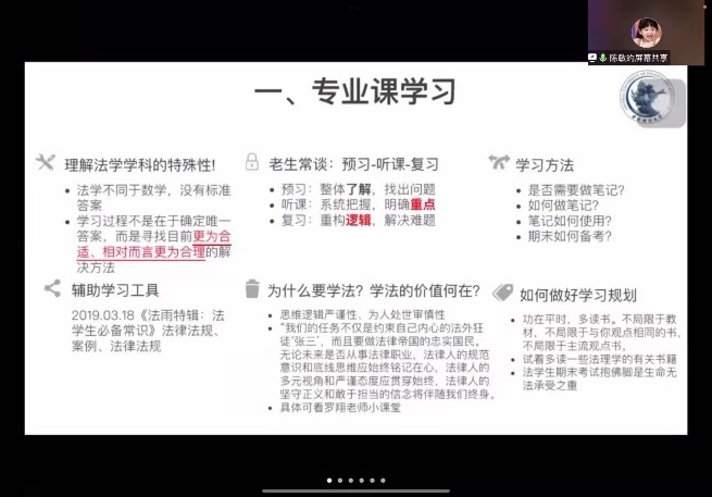 2021年10月30日19点20分,公司举办2021级本科生“法学专业与法律职业”课程暨新生引航工程系列讲座。本次主题是“朋辈经验分享之我是如何度过小萌新的‘阵痛期’”,由公司2020届本科优秀毕业生陈敏主讲,FUN88乐天使全体2021级本科生参加。