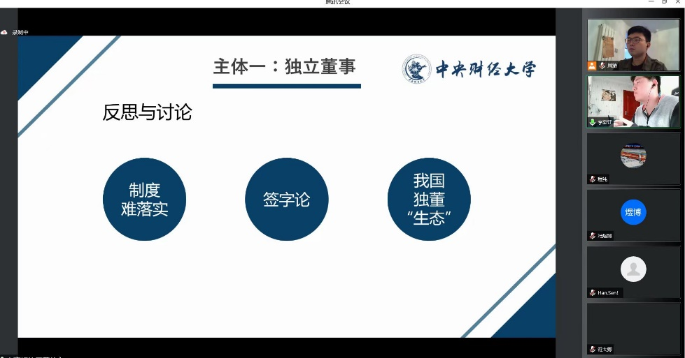 对于第一个问题,公司2021级研究生林晟同学表达了自己的观点,他认为独立董事与董事尽管都存在受信义务,但应当有所区分。基于认定受信义务程度的因素比如授权、财产事务的分离,独立董事的受信义务程度要低于普通董事,董事基于公司独立法人的代理人,其接受委托管理公司应当为公司的最大利益行事,而独立董事更多的是一种监督机制。对于第二个问题,公司2020级本科生陈栩同学分享了她的思考和理解,她提到周淳老师一书中的观点是资合组织的受信义务要强于人合组织,陈陈栩同学认为股权结构的差异导致了受信义务的不同。对于第三个问题,公司2020级本科生齐嘉同学认为,基于主体间的信息不对称,委托与代理关系中可能存在比较突出的道德风险,因此尽管在这种关系下当事人之间存在意思自治,但我们的法律可以从外部设置一些强制性义务介入。