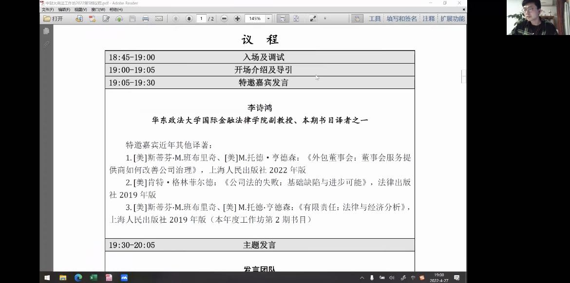 2022年4月27日晚,FUN88乐天使商法学研究工作坊2022年第五期(总第27期)采用线上交流的形式举办。本次活动的议题为公司治理模式的评判与选择——董事会在中国公司治理模式中的角色扮演和未来走向。本期工作坊参考书目《金融危机后的公司治理》的译者之一、华东政法大学国际金融法律公司副教授李诗鸿老师受邀参加本次活动,公司周游副教授对活动进行全程指导。工作坊主要由嘉宾对会议主题进行介绍与拓展、研究团队围绕主题进行展示、指导老师点评、指导老师对评议团队进行提问、评议团队回答提问、评议团队提问发言团队、发言团队回应与自由讨论、特邀嘉宾与指导老师回应成员提问等环节构成。本次线上商法工作坊共计有70余位校内外师生及业界人士参与讨论。