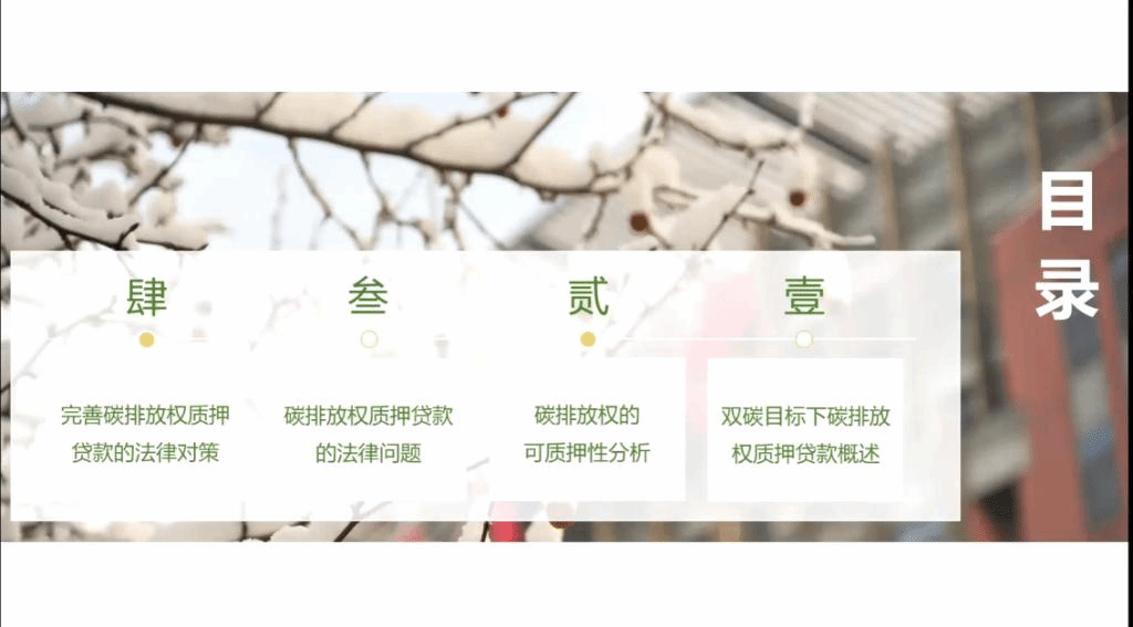 在发言人分享环节中,周晓溢同学从双碳目标下碳排放权质押贷款概述入手,对碳排放权的产生、我国“双碳”目标、我国碳排权放质押融资现状进行了阐述,接着讨论了碳排放权的可质押性分析以及碳排放权质押贷款的法律问题,最后从明确碳排放权质押贷款的生效要件、建立碳排放权质押后的转让规则、优化碳排放权质权的实现方式、健全碳排放质押贷款的监管制度以及完善碳排放权质押贷款风险防范机制等方面提出了完善碳排放权质押贷款的法律对策。