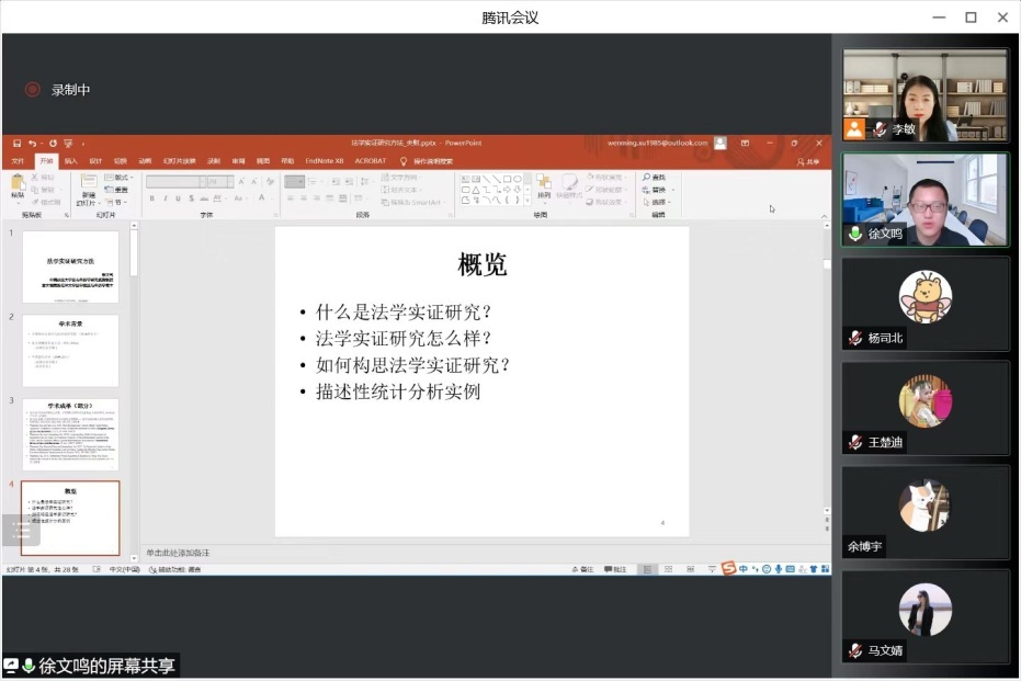 徐文鸣老师紧密结合自身学习和研究经历,从“什么是法学实证研究、法学实证研究怎么样、如何构思法学实证研究、描述性统计分析实例”这四个方面作了精彩分享。