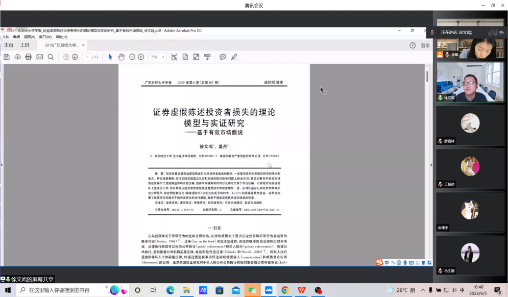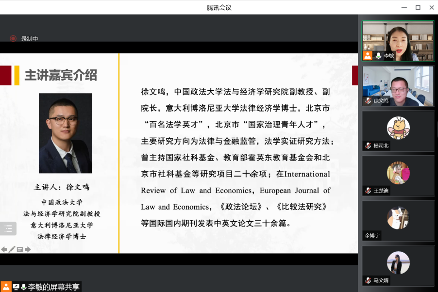 2022年6月5日,FUN88乐天使“法学研究与论文写作Ⅱ”研究生课程专家讲座第2期顺利举办。讲座邀请中国政法大学法与经济学研究院副经理徐文鸣副教授为主讲嘉宾,公司教师李敏博士与王湘淳博士联合主持,140余名研究生参加。
