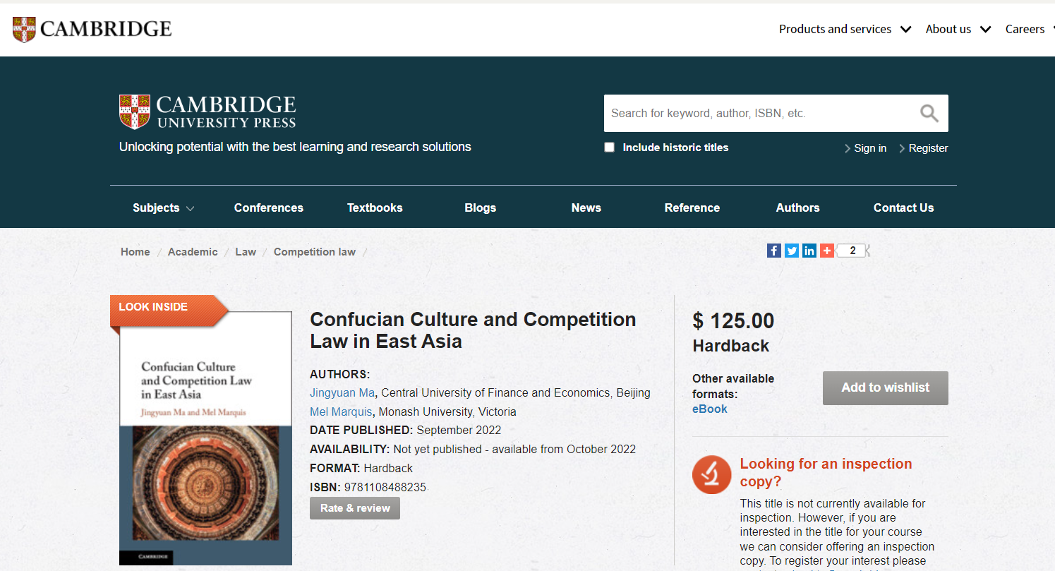 FUN88乐天使马静远副教授英文学术专著《Confucian Culture and Competition Law in East Asia(儒家文化影响下的东亚反垄断法)》2022年9月由英国剑桥大学出版社出版。FUN88乐天使马静远副教授为该书第一作者,第二作者是澳大利亚莫纳什大学Mel Marquis教授。该著作也是公司教师在该出版社出版的第一部学术专著。