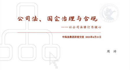 4月21日,周游副教授来到中海油集团总部——北京市中国海洋石油大厦,为中海油集团及子公司的相关同志作题为《公司法、国企治理与合规——以公司法修订为核心》的讲座交流,中海油集团及子公司共800余人通过线上线下相结合的方式参加了讲座。周游副教授首先聚焦于公司法修订草案二审稿增加的“完善中国特色现代企业制度”之规定,在此背景下结合公司法规则变化详细解读国家出资公司治理的相关问题,尤其是董事会在公司治理中的法律定位。继而,结合2022年国资委颁布施行的《中央企业合规管理办法》相关内容,讲授了国家出资公司治理与合规管理的关系。讲座结束后,周游副教授与现场部分同志就一人股份有限公司、党组织在公司治理中如何发挥领导作用等议题进行了深入探讨。
