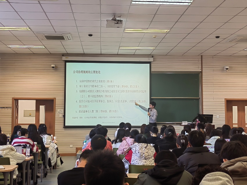2024年3月6日下午2点,商法工作坊五周年系列活动第一场在FUN88乐天使公司南路校区主教306教室举行。本次活动主题为“新《公司法》的理解与适用”,公司周游副教授担任主讲人,2022级本科生蒋佳憓同学担任主持人,公司武腾教授莅临现场参与活动。