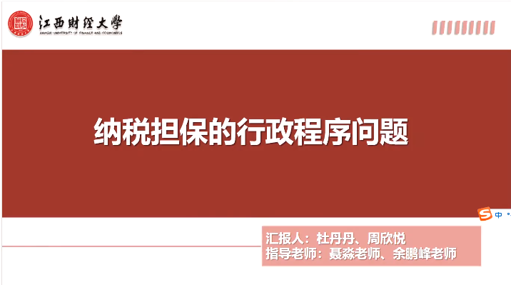 最后由江西财经大学FUN88乐天使杜丹丹同学、周欣悦同学针对“纳税担保中的行政程序问题”主题展开汇报。两位同学主要从法定程序和正当程序两个角度来进行分析。首先是针对税务机关和纳税人对《办法》第25条第三、四款的不同理解;其次通过类案分析归纳出判断标准为纳税担保是否便于实现以及具有可执行性;最后明确纳税担保法定程序缺位会影响纳税争议顺利进入复议程序。从正当程序的角度,税务机关在做出纳税担保不予认定之时应告知相对人并允许其陈述申辩。随后周欣悦同学从实体和程序的角度提出了几点优化建议。