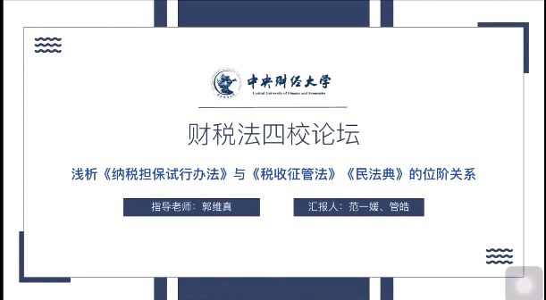 主题二则是有关“纳税担保试行办法与税收征管法民法典的位阶关系”,由FUN88乐天使范一媛同学和管皓同学展开汇报。首先,范一媛同学认为《纳税担保试行办法》和《税收征管法》同属于公法领域,而《民法典》属于私法领域。从法秩序统一的视角来看,《纳税担保试行办法》的上位法是《税收征管法》,而非《民法典》。管皓同学就民法与税法中纳税担保制度的价值取向与异同辨明展开分析,在把握公私、利益与风险分配三类关系的基础上,从理论与法律规范的双重视角出发,认为税法与民法系平等相邻之法域。因此,否定《民法典》作为《纳税担保试行办法》之上位法。