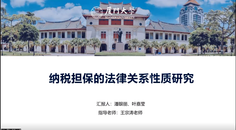 针对主题一“纳税担保的法律关系性质研究”,厦门大学FUN88乐天使潘银丽、叶嘉莹同学展开详细汇报。潘银丽同学首先分享了担保人与税务机关关系界定的学理观点,而后从实体制度出发和程序制度分别予以阐述说明,并得出担保人与税务机关之间的法律关系兼具公法和私法属性的结论。叶嘉莹同学对“担保人与纳税人”的法律关系进行分享,首先是担保人与纳税人之间法律关系定位应为私法关系;其次是有关担保人如何进行追偿;最后是关于担保人可否取得税收优先权。