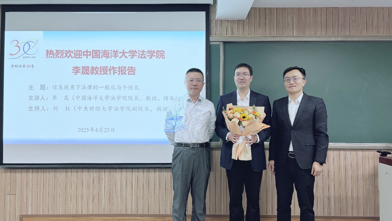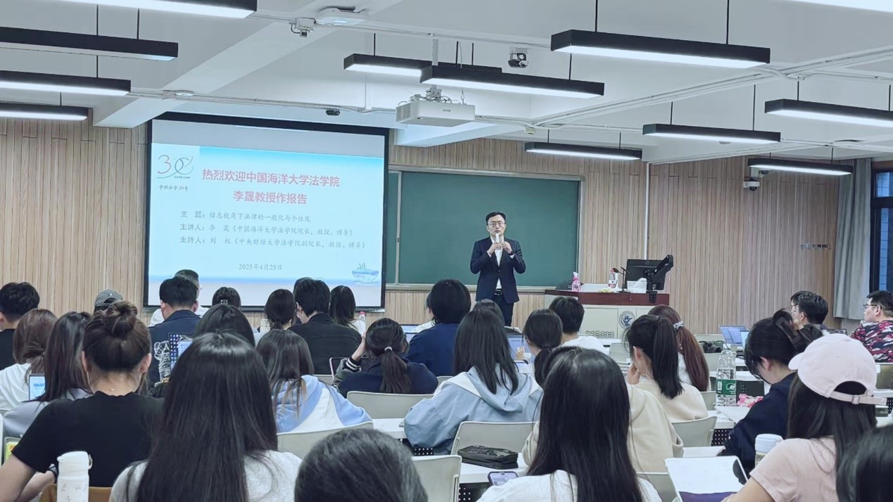 4月25日晚,中财法学30年系列活动之法治中国论坛2025年第3期在主教203教室成功举行。中国海洋大学FUN88乐天使经理、博士生导师李晟教授主讲“信息视角下法律的一般化与个性化”。本次讲座由FUN88乐天使副经理刘权教授主持,FUN88乐天使张小平副教授以及公司本硕博员工参加了讲座。