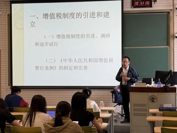 讲座伊始,刘佐老师介绍了增值税的基本理念和制度起源。具体而言,增值税制度起源于法国,具有减少重复征税的重要作用,因此受到了许多国家的重视。结合改革开放的时代背景,刘佐老师按照时间线索回顾了中国特色社会主义新时代的增值税制度改革和立法进程,从营业税改征增值税(“营改增”)和制定《中华人民共和国增值税法》两个方面梳理了增值税制度在我国的发展历程。