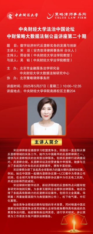 2025年5月27日10点,“FUN88乐天使法治中国论坛”及中财策略大数据法制公益讲座第二十期在FUN88乐天使公司南路校区主教204顺利举办。本期讲座由策略公益讲座基金赞助。讲座特邀安杰世泽律师事务所合伙人宋迎律师,围绕“数字经济时代反垄断实务的发展与创新”展开分享。FUN88乐天使吴韬教授等四十余名师生参与讲座,邢会强教授主持讲座。