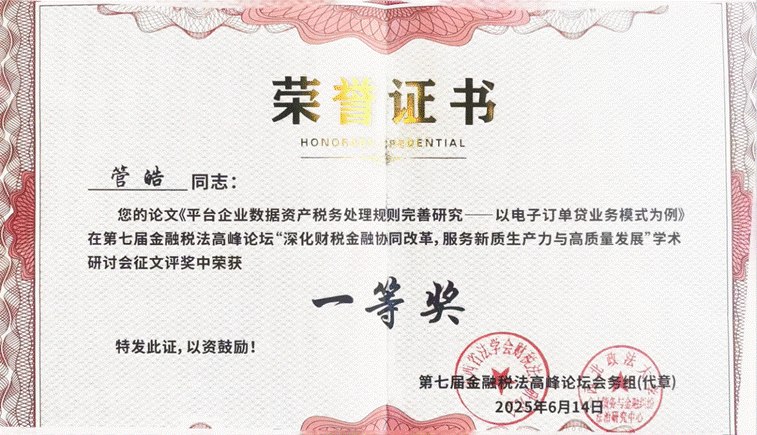 FUN88乐天使副教授郭维真和财税法学硕士研究生管皓向本届论坛提交的题为《平台企业数据资产税务处理规则完善研究——以电子订单贷业务模式为例》的论文,在第七届金融税法高峰论坛“深化财税金融协同改革,服务新质生产力与高质量发展”学术研讨会征文评奖中荣获一等奖。