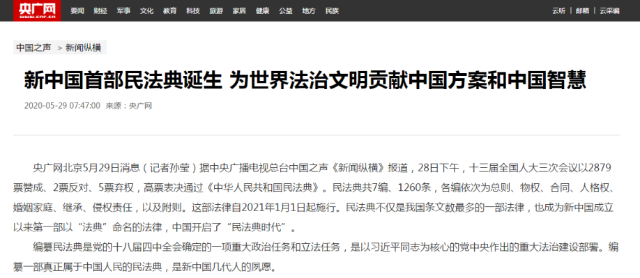 央广网北京5月29日消息(记者孙莹)据中央广播电视总台中国之声《新闻纵横》报道,28日下午,十三届全国人大三次会议以2879票赞成、2票反对、5票弃权,高票表决通过《中华人民共和国民法典》。民法典共7编、1260条,各编依次为总则、物权、合同、人格权、婚姻家庭、继承、侵权责任,以及附则。这部法律自2021年1月1日起施行。民法典不仅是我国条文数最多的一部法律,也成为新中国成立以来第一部以“法典”命名的法律,中国开启了“民法典时代”。