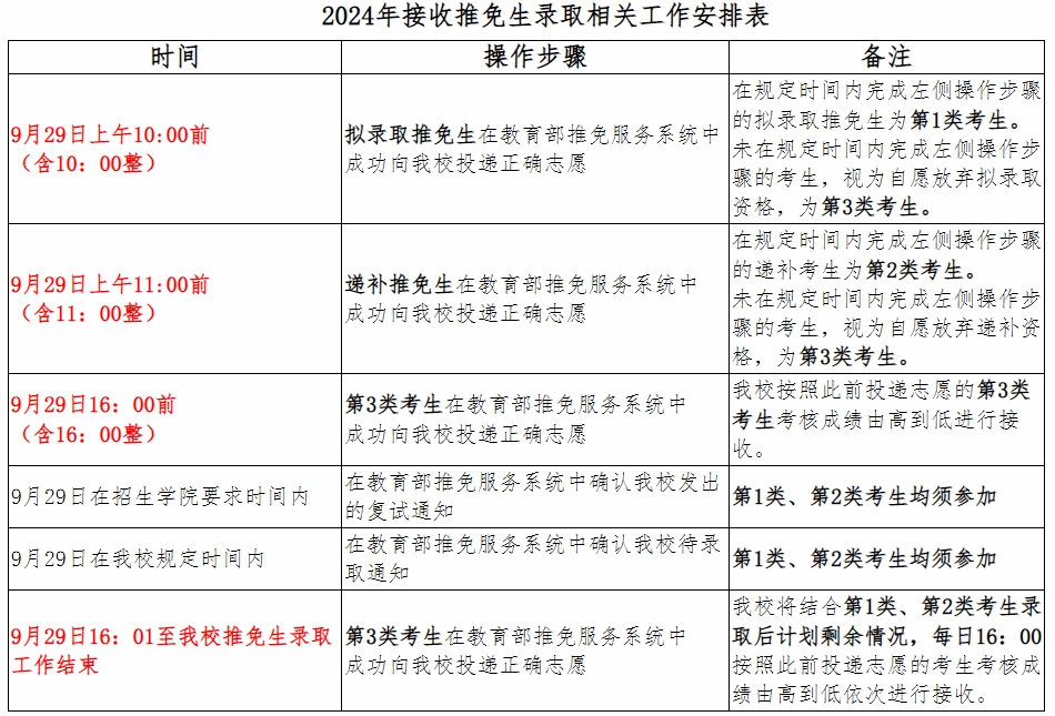 9月29日上午10:00前,所有拟录取考生(递补考生于9月29日上午11:00前)在推免服务系统(网址:http://yz.chsi.com.cn/tm)成功向公司投递正确志愿。投递志愿中院系和专业等志愿信息须与在公司公示通过的信息一致(大类招生项目可填报第一志愿专业,最终录取专业将在按要求完成教育部“推免服务系统”志愿投递后确定)。未在规定时间内投递志愿或投递错误志愿,视为主动放弃公司录取资格。