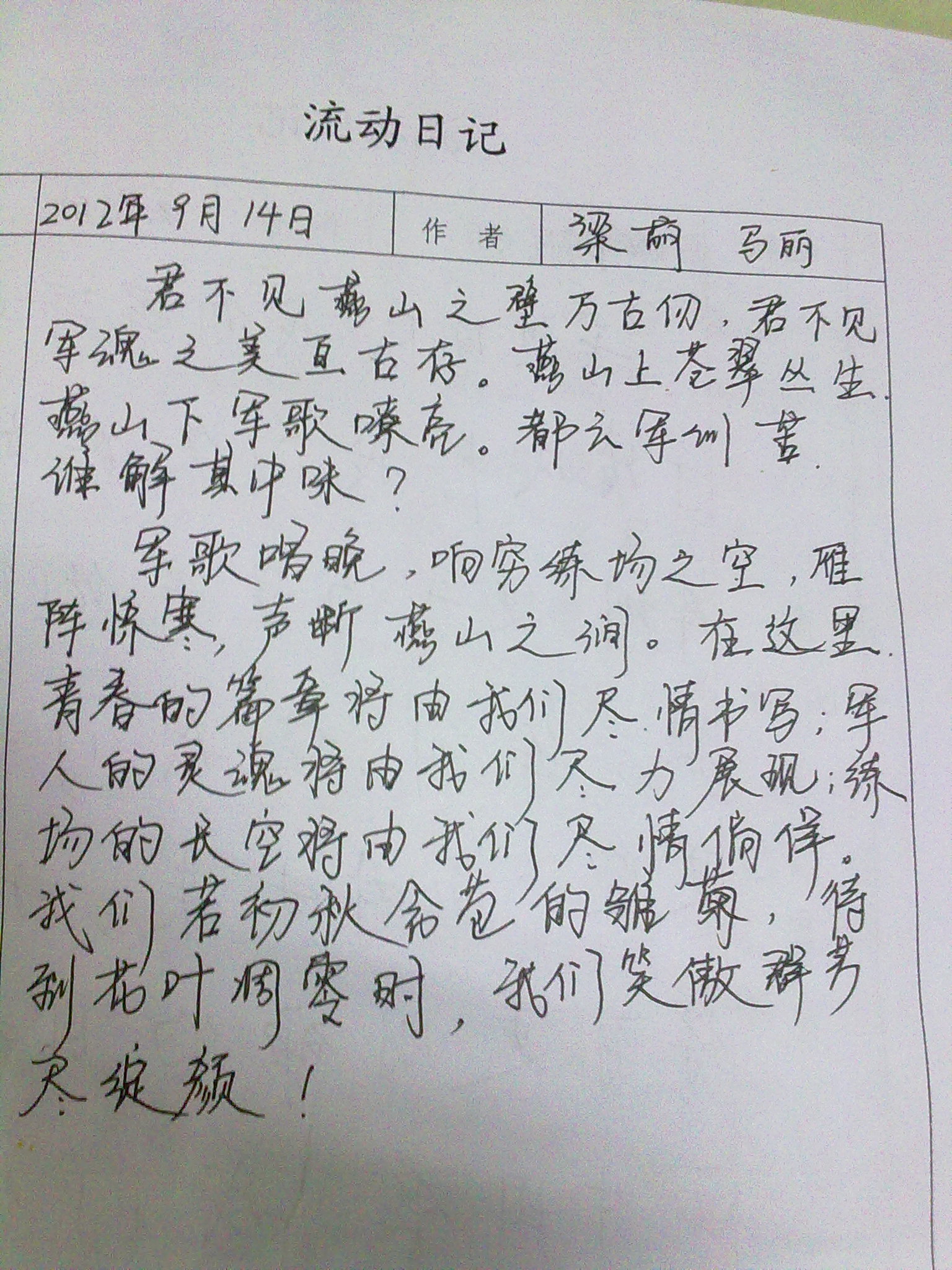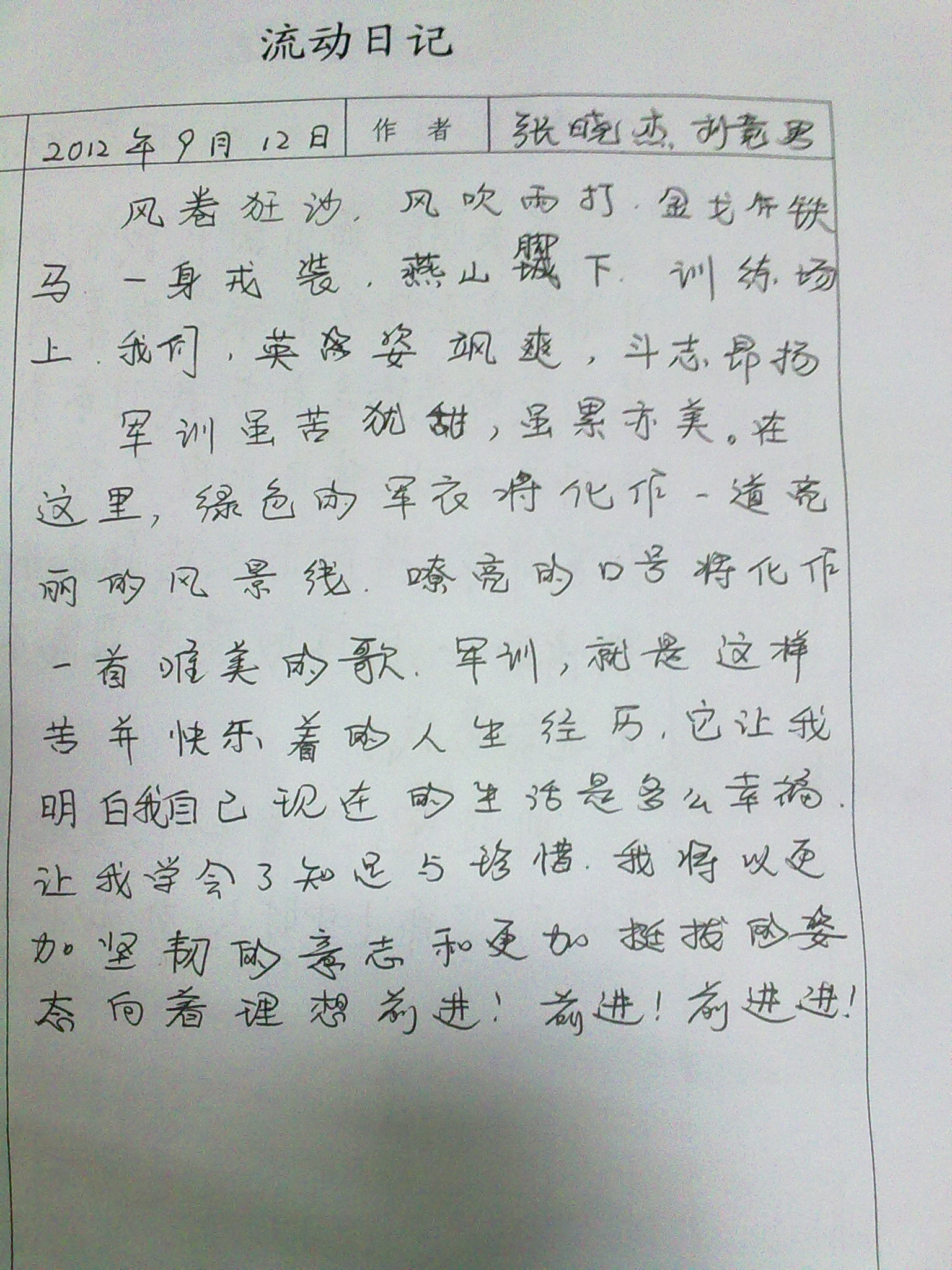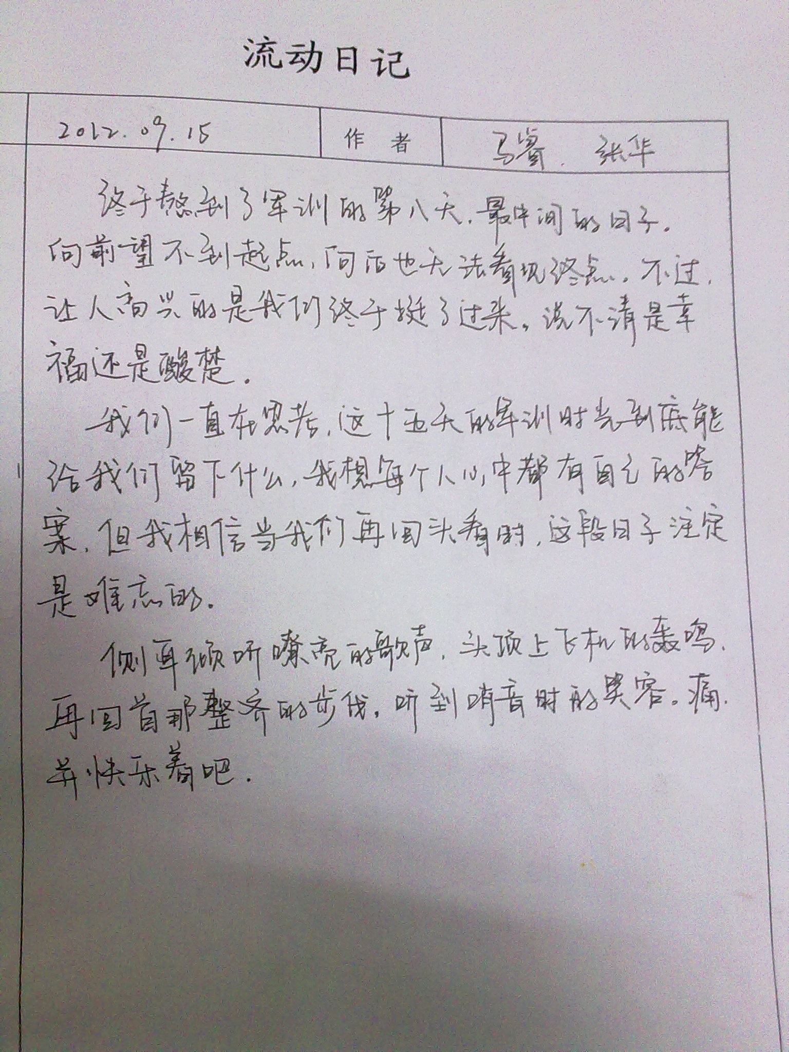 转眼间,公司135名2012级本科新生在龙庆峡员工军训基地的训练已经进入了第13天。军营里,再不见员工稚气的脸庞、单薄的身体,取而代之的是标准的军姿,严肃的纪律,坚毅的脸庞。下面,是我们摘取的部分军训学员的流动日记,以此来展示他们在绿色军营中的成长印记。请欣赏┄┄