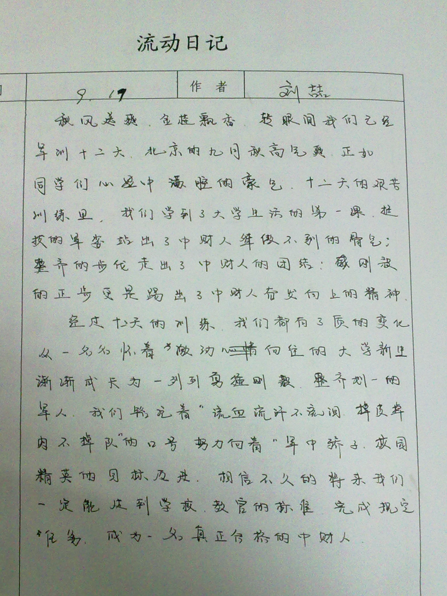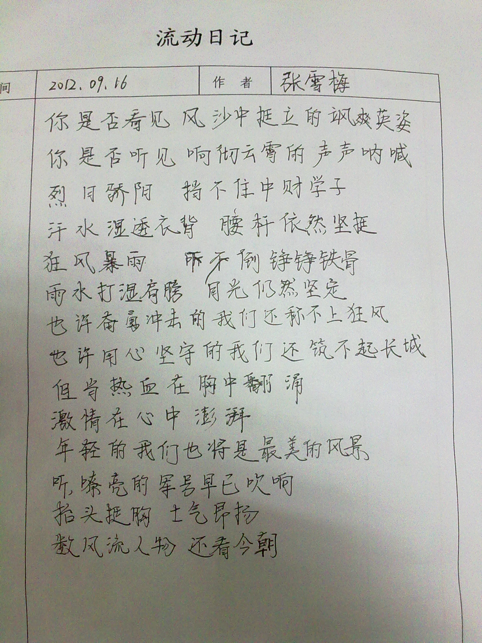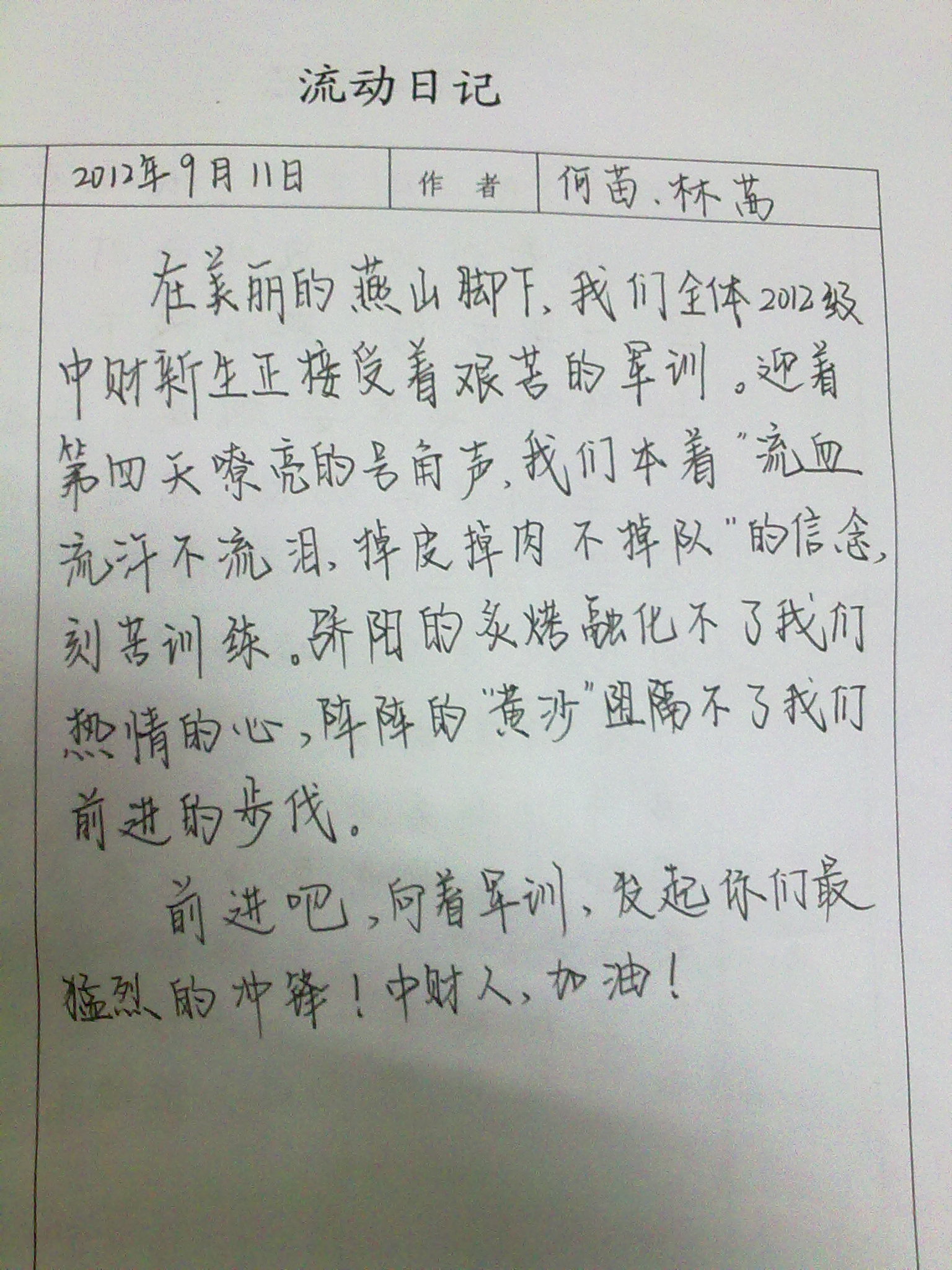 转眼间,公司135名2012级本科新生在龙庆峡员工军训基地的训练已经进入了第13天。军营里,再不见员工稚气的脸庞、单薄的身体,取而代之的是标准的军姿,严肃的纪律,坚毅的脸庞。下面,是我们摘取的部分军训学员的流动日记,以此来展示他们在绿色军营中的成长印记。请欣赏┄┄