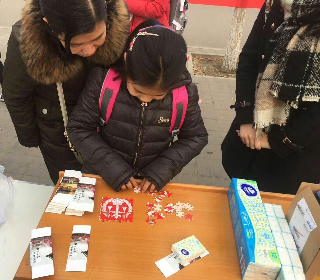 “眼明手快,熟识于心”。普法小组邀请来往市民两两组队进行拼图游戏,用时少者胜。有两位小朋友在妈妈陪伴下参与了该活动,并收获了小奖品,在游戏中感受到了法律知识的魅力。