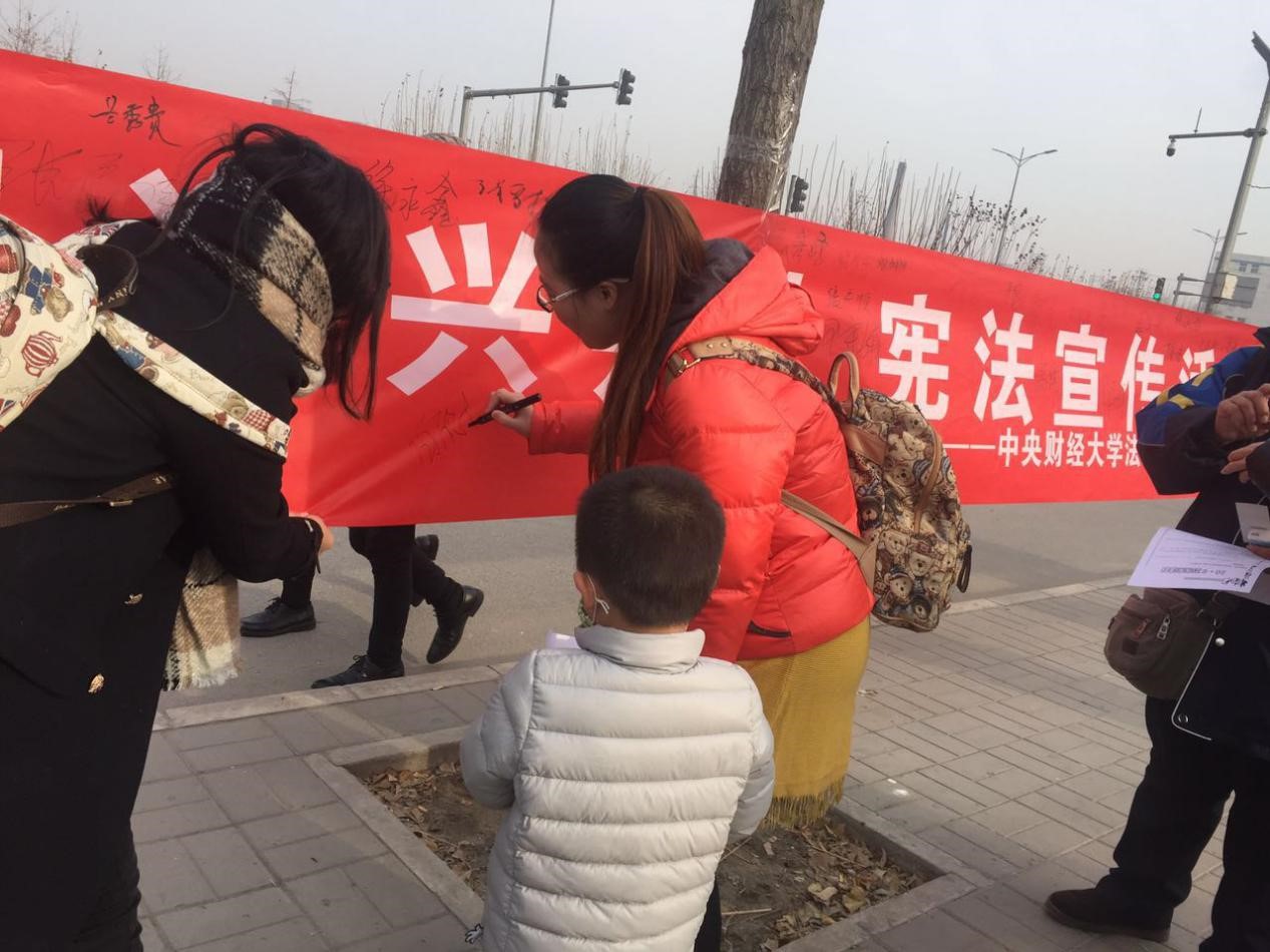 “一笔一墨,共绘蓝图”。普法小组同学们鼓励附近的市民在红色的横幅上签名,写下自己对法律的认识、期许等。不久,横幅已被市民们的各种签名布满。