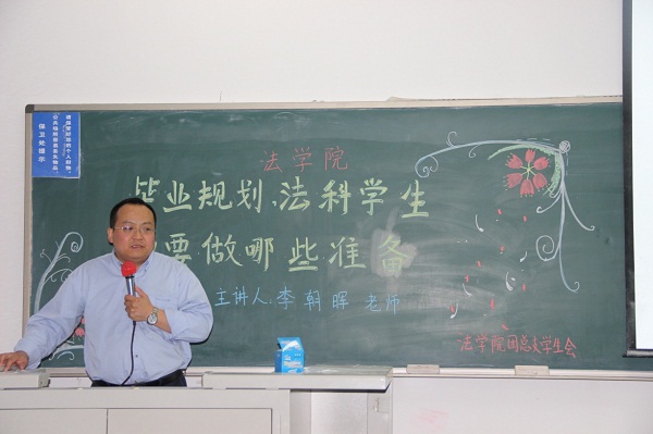 在第二部分,李朝晖副教授运用大量自己身边的实例向同学们展现了毕业后各种就业意向的发展。在论及银行柜员的职务时,他幽默地运用“数钱数到手抽筋”来形容银行业务的繁忙。对那些致力于公司法务或在司法部门工作的同学,他指出司法考试的通过是必备条件,并回忆起早期专职律师中相当一部分人并非科班出身,而是自学成才的例子来鼓励大家积极参与,甩掉害怕与拒绝的心理包袱。而最令人印象深刻的是李朝晖副教授对于法学的热忱,通过分享自己大学时期的实习经历,他反复告诫同学们无论何时都不要放弃自己的法学专业,要将法学融入生活,即使迫于生计,也绝不碌碌无为地像流水线般的虚度时间。