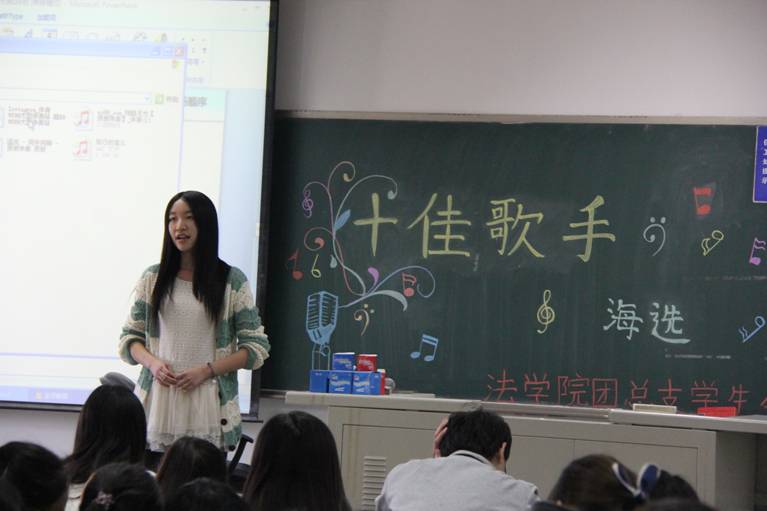接着,歌唱选手开始比赛,此次比赛共有14位选手参加。第一位演唱的是2011级的田晓阳,一首清唱的《眼泪》打动了评委,也感动了在座的大众评委们;接下来2012级皱晓戈的《Price tag》、2012级张丽敏的《后来》、2011级董娅娟《我只在乎你》,同样是用优美的歌声感染着在场的每一位观众和评委;一首《残酷月光》,2012级黄盛秦带领大家进入了一种净美的世界,优美婉转,赢来了观众的阵阵掌声;2012级少数民族同学肉先古丽·肉孜演唱的《allah》让人耳目一新,带领大家领略少数民族音乐的美妙;更让人激动的是2010级的陈逢源演唱的一首民族歌曲《好运来》,可谓是唱功十足,真正体现了民歌的精彩与嘹亮;2012级唐舒雨的《旅行的意义》、2011级吴任桓的《何必要在一起》让大家从民歌的优美中又回到了流行歌曲的旋律里;2012级洪慧英、马睿组合演唱的颇具创新意味的英文歌曲串烧《Baby/ A big big world》、2010级朴丹男清唱的《Safe and sound》,扎实的英文基础、标准的发音和清脆的嗓音给人一种听觉上的享受,掀起了此次比赛的高潮;2012级李韶涵演唱的网络流行歌曲《爱情买卖》带动全场,大家一起high了起来,在紧张的比赛氛围中获得了释放和轻松;2012级李琳楚的《loving you》和《someone like you》可谓是震撼全场,清美的高音,悠扬的美声时刻回响在耳畔,让人回味无穷。最后是由2012级卢星潼演唱的《同手同脚》以及与吴任桓合唱的《因为爱情》,给本次十佳歌手选拔赛划上了一个句号。